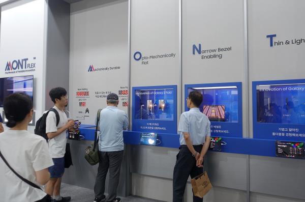 »ï¼ºµð½ºÇ÷¹ÀÌ´Â Àü½ÃÀå ÀÔ±¸ Àü¸é¿¡ ¸¶ÀÌÅ©·Î µð½ºÇ÷¹ÀÌ Àü½Ã¸¦ ¹èÄ¡Çß´Ù. 1.3ÀÎÄ¡ Å©±â¿¡ 4000PPI, 1¸¸´ÏÆ® ¹à±â¸¦ Áö¿øÇÏ´Â °íÇØ»óµµ·°íÈÖµµ ½ºÆåÀÇ ‘ÈÀÌÆ® ¿Ã·¹µµ½º(W-OLEDoS)’ Á¦Ç° 3´ë°¡ Àü½ÃµÅ, °ü¶÷°´ÀÌ ´«À» ´ë°í Á÷Á¢ üÇèÇÒ ¼ö ÀÖµµ·Ï ±¸¼ºµÆ´Ù. Àü½ÃÀå Áß¾Ó¿¡ ¹èÄ¡µÈ RGB-OLEDoS Á¸¿¡´Â 1.3/1.4ÀÎÄ¡Çü Á¦Ç° 2Á¾°ú ¿öÄ¡¿ë Á¦Ç° 2Á¾ÀÌ Àü½ÃµÆ´Ù. ¿öÄ¡¿ë Á¦Ç°Àº Æò¸é·°î¸é(3R Ä¿ºêµå) ŸÀÔÀ¸·Î °ø°³µÆÀ¸¸ç, °¢°¢ ÃÖ´ë 6000´ÏÆ®¿Í 4000´ÏÆ®ÀÇ ¹à±â¸¦ Áö¿øÇÑ´Ù. Æú´õºí Á¸¿¡¼´Â ‘MONTflex’¶ó´Â Àü¿ë ºê·£µå¸¦ ¾Õ¼¼¿ö °¶·°½Ã Z Æúµå7¿¡ Àû¿ëµÈ ±â¼úÀ» ¼Ò°³Çß´Ù.