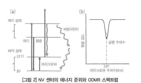 ´ÙÀ̾Ƹóµå ¾çÀÚ ¼¾¼ÀÇ °èÃø ¿ø¸®´Â ´ÙÀ½°ú °°´Ù. ms=0ÀÇ ¹Ù´Ú »óÅ¿¡ ÀÖ´Â NV ¼¾Å͸¦ ³ì»ö±¤À¸·Î ¿©±â(ÕäÑÃ)3)Çϸé Àû»ö Çü±¤À» ³»°í ¿ø·¡ÀÇ ms=0À¸·Î ¿ÏȵȴÙ([±×¸² 2-(a)]). À̶§ °ø¸í Á֯ļö(2.87GHz) ¸¶ÀÌÅ©·ÎÆÄ¸¦ Á¶»çÇϸé ÀüÀÚ½ºÇɰø¸í(ESR)¿¡ ÀÇÇØ ms=?±1 »óÅ·ΠÀüÀ̰¡ ÀϾÙ. ms=?±1¿¡¼ ±¤¿©±âµÇ¾úÀ» ¶§´Â ºñ¹æ»çÀüÀÌ »óŸ¦ °ÅÃÄ ms=0ÀÇ ¹Ù´Ú »óÅ·Π¿ÏÈµÉ È®·üÀÌ ³ô°í Çü±¤ °µµ´Â ¶³¾îÁø´Ù.