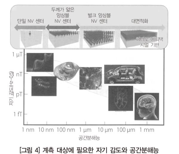 ÀÌ·¯ÇÑ Æ¯Â¡À» ´Ù¸¥ °í°¨µµ Àڱ⠼¾¼ÀÎ SQUID, ±¤ÆßÇÎ Àڷ°è(OPM)¿Í ºñ±³ÇÑ °ÍÀÌ [Ç¥ 1]ÀÌ´Ù. µ¿ÀÛ ¿Âµµ ȯ°æ, °ø°£ºÐÇØ´É, º¹ÇÕ °èÃø¿¡¼ ´ÙÀ̾Ƹóµå ¾çÀÚ ¼¾¼ÀÇ ¿ìÀ§¼ºÀÌ ÀÖ´Ù. ÀÚ°è¿Í ¿ÂµµÀÇ º¹ÇÕ °èÃø¿¡¼´Â [±×¸² 3-(b)]¿¡¼ º¸µíÀÌ ÀÚ°è´Â µÎ °ø¸í Á֯ļö°¡ °¥¶óÁö´Â ¹Ý¸é, ¿Âµµ´Â °ø¸í Á֯ļö°¡ À̵¿ÇÑ´Ù´Â Á¡¿¡¼ ÀÚ°è¿Í ¿Âµµ¸¦ µ¶¸³ÀûÀ¸·Î °áÁ¤ÇÒ ¼ö ÀÖ´Ù. ÀÌ´Â ÀÚ°è¿Í ¿Âµµ, Áï Á¤º¸¿Í ¿¡³ÊÁöÀÇ µ¿½Ã °èÃøÀÌ °¡´ÉÇÏ´Ù´Â °ÍÀ» º¸¿©ÁÖ¸ç, »ýü¿Í ¿¡³ÊÁö µð¹ÙÀ̽º¸¦ ¸ð´ÏÅ͸µÇÏ´Â µ¥ À¯¿ëÇÏ´Ù.