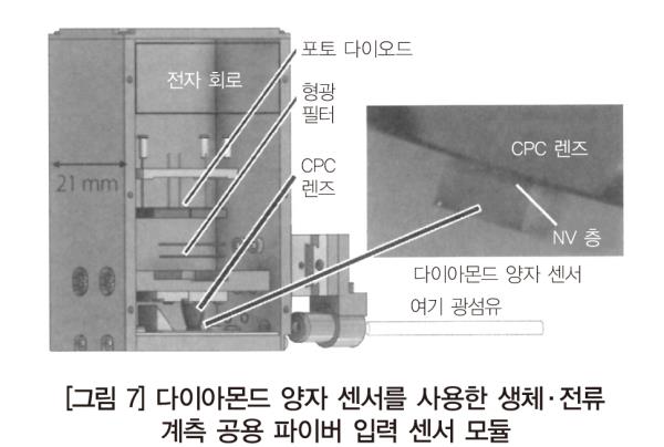 ƯÁ¤ üÁ¶Á÷¿¡ Á÷°áÇÑ ¸²ÇÁÀýÀ» µ¿Á¤Çϱâ À§ÇØ Ã¼Á¶Á÷¿¡ ÀÚ¼º ³ª³ë ÀÔÀÚ¸¦ ÁÖÀÔÇÑ µÚ ¸²ÇÁ°üÀ» È帣´Â ÀÚ¼º ³ª³ë ÀÔÀÚ·Î Àڰ踦 °èÃøÇÏ´Â ‘ÇÁ·ÎºêÇü ´ÙÀ̾Ƹóµå ¾çÀÚ ¼¾¼’µµ °³¹ßµÇ¾ú´Ù. ÀÌ·¯ÇÑ °ËÁõ °á°úµéÀ» Åä´ë·Î ½ÃÇè Á¦ÀÛÇÑ °ÍÀÌ [±×¸² 7]ÀÇ ¼ÒÇü ¼¾¼ ¸ðµâÀÌ´Ù. ´ÙÀ̾Ƹóµå Ãø¸é¿¡¼ ¿©±â±¤À» ÀÔ»çÇØ ¿©±â ºÎÇǸ¦ ´Ã¸®°í, ¿©±â±¤ÀÇ Èçµé¸²À» º¸»óÇÒ ¼ö ÀÖ´Â ±¤Çаè¿Í ½ÅÈ£ ó¸® ȸ·Î¸¦ ¼³Ä¡ÇØ ½ÉÀÚ °èÃøÀÌ °¡´ÉÇÑ °¨µµ 44pT/¸¦ ½ÇÇöÇß´Ù. ÀÌ ¸ðµâÀº °èÃø ´ë»óÀÇ Á¢Ã˸éÀ» ¹Ù´Ú¸éÀ¸·Î ÇÒÁö, Ãø¸éÀ¸·Î ÇÒÁö¿¡ µû¶ó »ýü °èÃø°ú ¹Ù·Î ÀÌ¾î¼ ¼Ò°³ÇÒ Àü·ù °èÃø¿¡µµ Àû¿ëÇÒ ¼ö ÀÖµµ·Ï ±¸¼ºÇß´Ù.