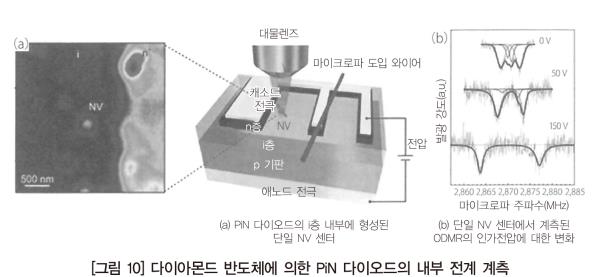 ÆÄ¿ö µð¹ÙÀ̽º ³»ºÎ ¸ð´ÏÅ͸µ ´ÙÀ̾Ƹóµå´Â ÆÄ¿ö µð¹ÙÀ̽º Àç·á·Îµµ ¿¬±¸µÇ°í ÀÖ´Ù. [±×¸² 10-(a)]¿¡¼ º¸µíÀÌ ´ÙÀ̾Ƹóµå´Â ºØ¼Ò¿Í ÀÎÀ» µµÇÎÇØ PiN Á¢ÇÕÀ» ¸¸µé ¼ö ÀÖ´Ù. PiN Á¢ÇÕÀÇ iÃþ ¾È¿¡ NV ¼¾Å͸¦ Çü¼ºÇϰí, ¿ª¹æÇâ ¹ÙÀ̾·Î °Àü°è¸¦ °Ç »óÅ¿¡¼ ODMRÀ» °üÃøÇß´Ù. ±×¸®°í [±×¸² 10-(b)]¿Í °°ÀÌ Àü°è °µµ °ª¿¡ ´ëÀÀÇÑ NV ¼¾ÅÍÀÇ ÀüÀÚ »óÅ¿¡ ´ëÇÑ ½´Å¸¸£Å© È¿°ú(Stark effect)·Î ODMRÀÇ °ø¸í Á֯ļö°¡ º¯ÇÏ´Â °ÍÀ» È®ÀÎÇß´Ù. ÇØ´ç ±â¼úÀº µ¿ÀÛ ÁßÀÎ ÆÄ¿ö µð¹ÙÀ̽º ³» Àü°è ÁýÁß °ËÃâ¿¡ Àû¿ëÇÒ ¼ö ÀÖ¾î, °íÀå ÇØ¼®°ú µð¹ÙÀ̽ºÀÇ ½Å·Úµµ Çâ»óÀ¸·Î À̾îÁø´Ù. ¶ÇÇÑ ÆÄ¿ö µð¹ÙÀ̽º ³»ºÎÀÇ Àü°è º¤Å͸¦ °èÃøÇÏ´Â °Íµµ °¡´ÉÇÏ´Ù.