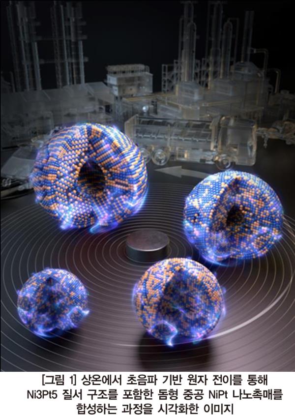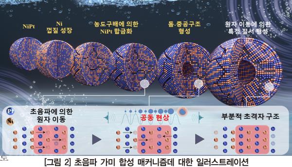 ÃÊÀ½ÆÄ °¡¹Ì ÇÕ¼º ¸ÅÄ¿´ÏÁò [±×¸² 2]´Â »ó¿Â ¹× »ó¾Ð¿¡¼ ÃÊÀ½ÆÄ¸¦ ÀÌ¿ëÇÑ ¼ö¼ÒÈºØ¼Ò È¯¿ø ¹ÝÀÀÀ» ÅëÇØ ÇÕ¼ºµÈ ‘Ni3Pt5’ ÃʰÝÀÚ ±¸Á¶ »óÀ» Æ÷ÇÔÇÏ´Â ´Ù°áÁ¤ µ¼-Áß°ø ±¸Á¶ÀÇ NiPt ³ª³ëÇÕ±Ý Çü¼º ¸ÞÄ¿´ÏÁòÀ» °³·«ÀûÀ¸·Î ³ªÅ¸³½ °ÍÀÌ´Ù. Ãʱ⿡´Â NiPt ³ª³ëÀÔÀÚ(¾à 3nm)°¡ ź¼Ò ±âÆÇ À§¿¡ ºü¸£°Ô Çü¼ºµÇ°í, ÀÌÈÄ ºü¸¥ Ni ȯ¿øÀ¸·Î ÀÎÇØ ¾à 10ºÐ À̳»¿¡ Pt@Ni ÄÚ¾î-½© ±¸Á¶·Î ¹ß´ÞÇÑ´Ù. ³óµµ ±¸¹è¿¡ ÀÇÇÑ Ä¿ÄË´Þ1) È®»êÀº ÇÕ±ÝÈ ¹× Áß°ø ±¸Á¶ Çü¼ºÀ» ÃËÁøÇÑ´Ù.