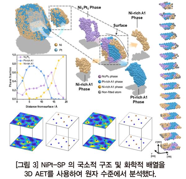 ÀÌ ¿µ¿ª¿¡¼ ¿øÀÚ ±¸Á¶¸¦ ´õ¿í Á¤¹ÐÇÏ°Ô ºÐ¼®ÇÏ¿© ÃÑ 1,534°³ÀÇ ¿øÀÚ(Ni 591°³ + Pt 943°³)¸¦ È®ÀÎÇÑ °á°ú, ±¹¼ÒÀû ¿øÀÚ ±¸Á¶¸¦ ±â¹ÝÀ¸·Î °áÁ¤¸³ ³» °¢ ¿øÀÚ¿¡ ´ëÇØ »ó´ç ºÎºÐÀÌ Ni3Pt5 ÃʰÝÀÚ ±¸Á¶ »ó¿¡ ÇÒ´çµÇ¾î NiPt-SP ³ª³ëÀÔÀÚ¿¡¼ Ni3Pt5ÀÇ ÈÇÐÀû ¹è¿À» Á÷Á¢ÀûÀ¸·Î ÀÔÁõÇß´Ù. Ãß°¡·Î, AET¸¦ ÅëÇØ Ni°¡ dzºÎÇÑ A1 »óÀÇ ¿øÀÚ°¡ Ç¥¸é ±Ùó¿Í ÀÎÁ¢ °áÁ¤¸³ÀÇ °æ°è¿¡ ÁÖ·Î ÁýÁߵǾî ÀÖÀ½À» º¸¿©ÁÖ¾ú´Ù. ÀÌ´Â Ni ¿øÀÚ°¡ ³ª³ëÀÔÀÚ¿¡¼ ¿ÏÀüÈ÷ ¿ëÃâµÇÁö ¾Ê°í Ç¥¸é°ú °áÁ¤¸³°è·Î ºÐ¸®µÇ´Â °æÇâÀÌ ÀÖÀ½À» ³ªÅ¸³½´Ù. Pt ºÐÀ² ¹× »ó ºÐÆ÷ °î¼±À» ±â¹ÝÀ¸·Î ÇÑ Á¤·® ºÐ¼®Àº Ç¥¸é ¹× °áÁ¤¸³°è ±Ùó¿¡¼ Ni°¡ dzºÎÇÑ A1 »óÀÇ ºñÀ²ÀÌ ´õ ³ôÀ¸¸ç, °áÁ¤¸³ ³»ºÎ·Î ´õ ±íÀÌ µé¾î°¥¼ö·Ï Pt°¡ dzºÎÇÑ A1 »ó°ú Ni3Pt5 ÃʰÝÀÚ ±¸Á¶ »óÀÌ ¿ì¼¼ÇØÁö´Â °ÍÀ» º¸¿©ÁØ´Ù.