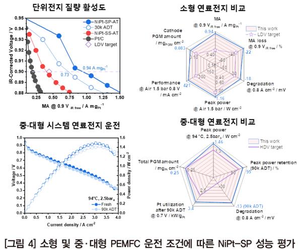 ¼ÒÇü ¿¬·áÀüÁö ¿îÀü Á¶°Ç¿¡¼´Â 80¡É, 1.5baraÀÇ ¾Ð·Â°ú 0.083mgPt/§²ÀÇ ¹é±Ý ·Îµù ÇÏ¿¡ Å×½ºÆ®°¡ ÁøÇàµÇ¾ú´Ù. NiPt-SP´Â Áú·® Ȱ¼ºµµ 0.94 A/mgPt¸¦ ±â·ÏÇÏ¿© DOE ¼ÒÇü Ÿ°Ù(0.44 A/mgPt)À» Å©°Ô ÃʰúÇß´Ù.