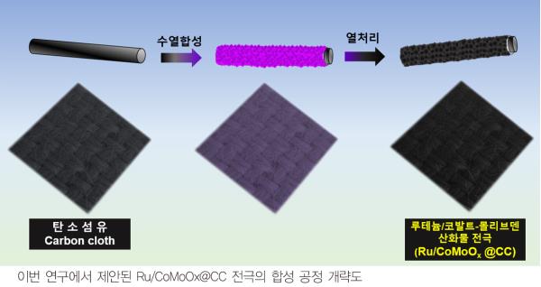 “°íÈ¿À²ÀÌ¸é¼ °æÁ¦ÀûÀÎ ¼ö¼Ò »ý»ê±â¼ú” Æò°¡ ¿¬±¸ÁøÀº Àü±â°¡ Àß ÅëÇϴ ź¼Ò¼¶À¯(Carbon cloth, CC) À§¿¡ ·çÅ×´½(Ru), ÄÚ¹ßÆ®(Co), ¸ô¸®ºêµ§(Mo)À» Á¶ÇÕÇÑ °í¼º´É Ã˸Ÿ¦ ¾ñ¾î ¼ö¼Ò »ý»ê¿ë Àü±Ø(Ru/CoMoOx@CC)À» Á¦ÀÛÇß´Ù. ź¼Ò¼¶À¯´Â ¸Ó¸®Ä«¶ôó·³ ¾ãÀº ź¼Ò ½ÇÀÌ ÃµÃ³·³ Â¥¿© ÀÖ´Â ±¸Á¶·Î, Àü±â Ã˸Ÿ¦ ÁöÁöÇÏ´Â »À´ë ¿ªÇÒÀ» Çϰí, Àü±â È帧À» µµ¿Í Àü±Ø ¼º´ÉÀ» ³ôÀÌ´Â ¿ªÇÒÀ» ÇÑ´Ù.