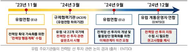 À¯·´¿¡³ÊÁö±ÔÁ¦Çù·Âû(ACER)Àº ¡¸Àü·Â¸Á Çൿ°èȹ¡¹ ³» ÇÙ½É »ç¾ÈÀÎ Àü·Â¸Á ¼±(à») ÅõÀÚ¿¡ ´ëÇÑ ÇöȲ ÆÄ¾ÇÀ» ¸ñÀûÀ¸·Î, ’24³â 3¿ù¿¡ 22°³ ±¹°¡¸¦ ´ë»óÀ¸·Î °ü·Ã ¼³¹®Á¶»ç¸¦ ½Ç½ÃÇß´Ù. Á¶»ç °á°ú °ø½ÄÀûÀÎ ¼± ÅõÀÚ Á¤ÀÇ´Â ¾ø¾úÀ¸³ª, ÀϺΠ±¹°¡¿¡ À¯»çÇÑ »ç·Ê°¡ ÀÖ´Â °ÍÀ¸·Î ³ªÅ¸³µ´Ù. EU´Â °¢±¹ ±ÔÁ¦±â°üÀÌ Âü°íÇÒ ¼ö ÀÖ´Â Àü·Â¸Á ¼± ÅõÀÚ¿Í °ü·ÃÇÑ ÁöħÀ» ¹ßÇàÇϱâ À§ÇØ ÀÌÇØ°ü°èÀÚ¸¦ ´ë»óÀ¸·Î Ãß°¡ ÀǰßÁ¶»ç¸¦ ½ÃÇàÇß´Ù. À¯·´ °èÅë¿î¿µÀÚ ¿¬ÇÕ(ENTSO)Àº ¡ºÀü·Â¸Á ¼± ÅõÀÚ Áöħ¡» ¼ö¸³ ½Ã °í·ÁµÇ¾î¾ß ÇÒ ±Ç°í»çÇ×À» Á¦½ÃÇß´Ù.