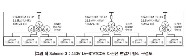 1.3. 440V LV-STATCOM + ´Ù±Ç¼± º¯¾Ð±â ¹æ½Ä (Scheme 3) ¢º±¸¼º ¿ø¸® : ¼ö¸¹Àº ¼Ò¿ë·® Àú¾Ð ÀιöÅÍ¿Í Æ¯¼ö ¼³°èµÈ ´Ù±Ç¼± º¯¾Ð±â¸¦ ÀÌ¿ëÇÏ¿© Àü¾ÐÀ» ½Â¾ÐÇÏ°í ¿ë·®À» ÇÕ¼ºÇÏ´Â ¹æ½ÄÀÌ´Ù. [±×¸² 5] ¢ºÆ¯Â¡ ¹× ÇѰèÁ¡ : ÀúÀü¾Ð ¼ÒÀÚ ÀÚüÀÇ ´Ü°¡´Â Àú·ÅÇÏ´Ù´Â ÀåÁ¡ÀÌ ÀÖÀ¸³ª, ÇÊ¿äÇÑ ÀιöÅÍÀÇ ¼ö·®ÀÌ ¸Å¿ì ¸¹°í Ư¼ö ¼³°èµÈ ´Ù±Ç¼± º¯¾Ð±âÀÇ ºñ¿ëÀÌ ³ô¾Æ, ½ÇÁ¦ ÃÑ ÃʱâÅõÀÚºñ´Â ¼¼ ¹æ½Ä Áß °¡Àå ³ôÀ» ¼ö ÀÖ´Ù. ¶ÇÇÑ ´Ù¼öÀÇ ÀιöÅÍ¿Í º¯¾Ð±â¿¡¼ ¹ß»ýÇÏ´Â ¼Õ½ÇÀÌ ÁßøµÇ¾î ½Ã½ºÅÛ È¿À²ÀÌ ¾à 95% ¼öÁØÀ¸·Î °¡Àå ³·¾Æ, ¿¬°£ Àü·Â¼Õ½Çºñ¿ëÀ» Å©°Ô Áõ°¡½ÃŲ´Ù. °¡Àå ³ÐÀº Á¡À¯ ¸éÀû(Scheme 1 ´ëºñ ¾à 4.4¹è¿¡ ´ÞÇÏ´Â ¾à 554§³)À» ÇÊ¿ä·Î Çϸç, º¹ÀâÇÑ ±¸Á¶·Î ÀÎÇØ ½Å·Ú¼ºÀÌ ³·°í À¯Áöº¸¼ö ³À̵µ°¡ ³ôÀº ´ÜÁ¡ÀÌ ÀÖ¾î, ÃѼÒÀ¯ºñ¿ë Ãø¸é¿¡¼ °¡Àå ºÒ¸®ÇÑ ¹æ½ÄÀ¸·Î ÆÇ´ÜµÈ´Ù.