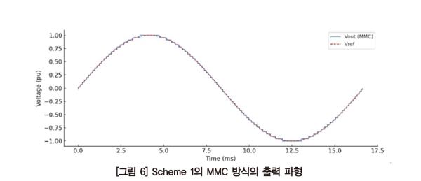 [±×¸² 6]Àº Scheme 1¿¡¼ MMC ¹æ½ÄÀÇ Ãâ·Â ÆÄÇüÀ» ³ªÅ¸³½´Ù. MMC´Â °¢ ¼ºê ¸ðµâÀÇ Á¤¹ÐÇÑ Á¦¾î¸¦ ÅëÇØ ¸Å¿ì Á¤ÇöÆÄ¿¡ °¡±î¿î °è´ÜÇü ÆÄÇüÀ» Çü¼ºÇϸç, ÀÌ´Â ½Ã½ºÅÛ Àü¾ÐÀÇ Total Harmonic Distortion(THD_v)À» 1% ÀÌÇÏ·Î ¾ïÁ¦ÇÒ ¼ö ÀÖ°Ô ÇÑ´Ù. °íÁÖÆÄ ½ºÀ§Äª ¾øÀ̵µ ¾çÈ£ÇÑ ÆÄÇü ǰÁúÀ» À¯ÁöÇÒ ¼ö ÀÖ¾î ÇÊÅÍ ¼³°è ºÎ´ãÀÌ Àû°í, Àå±âÀûÀ¸·Î °èÅë ³» ±â±â ¼ö¸í¿¡ ±àÁ¤ÀûÀÎ ¿µÇâÀ» ¹ÌÄ£´Ù.
