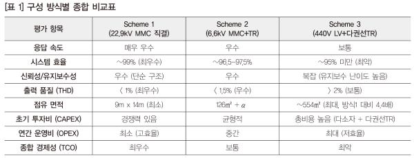 [Ç¥ 1]À» º¸¸é, ÃѼÒÀ¯ºñ¿ë(TCO, Total Cost of Owner ship) Ãø¸é¿¡¼ Scheme 1(22.9kV MMC Á÷°á¹æ½Ä)ÀÌ ´Ù¸¥ µÎ ¹æ½Ä¿¡ ºñÇØ ¾ÐµµÀûÀ¸·Î ¿ì¼öÇÑ °ÍÀ¸·Î ºÐ¼®µÈ´Ù. ÀÌ´Â ÃÖ±Ù MMC ¸ðµâÀÇ »ý»ê¹æ½Ä ÇÕ¸®È·Î Ãʱâ ÅõÀÚºñ(CAPEX) Ãø¸é¿¡¼ °æÀï·ÂÀ» È®º¸Ç߱⠶§¹®ÀÌ´Ù. ƯÈ÷ º¯¾Ð±â°¡ ¾ø¾î ¹ß»ýÇÏ´Â ±Øµµ·Î ³ôÀº ¿î¿µÈ¿À²(~99%)Àº ¿¬°£¿î¿µºñ(OPEX)¸¦ ÃÖ¼ÒÈÇÏ¿© Àå±âÀûÀÎ ºñ¿ë Àý°¨È¿°ú¸¦ ±Ø´ëÈÇÑ´Ù. ¶ÇÇÑ °¡Àå È¿À²ÀûÀÎ Á¡À¯ ¸éÀûÀº °£Á¢ÀûÀÎ ºÎÁö ºñ¿ë Àý°¨À¸·Î À̾îÁ®, ÃѼÒÀ¯ºñ¿ëÀÇ ¿ì¼ö¼ºÀ» ´õ¿í È®°íÈ÷ ÇÑ´Ù.