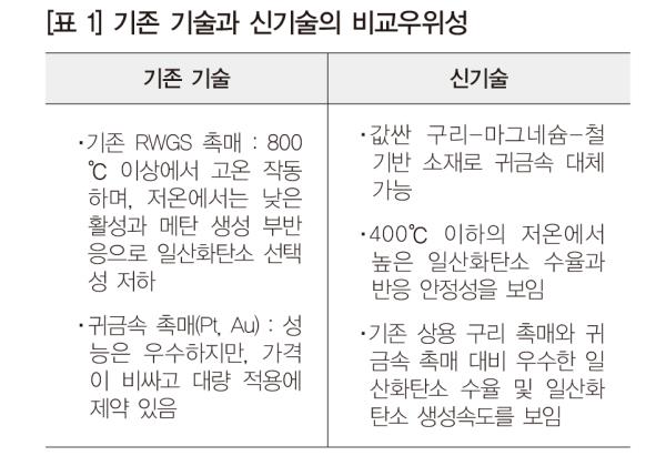 RWGS¹ÝÀÀÀº 800¡É ÀÌ»óÀÇ °í¿Â ȯ°æ¿¡¼ ÁøÇàµÉ ¶§ ÀÌ»êÈź¼Ò ÀüȯÀ²ÀÌ ³ô¾Æ, ´Ù¸¥ ±Ý¼Ó¿¡ ºñÇØ ¿ ¾ÈÁ¤¼ºÀÌ ³ôÀº ´ÏÄÌ ±â¹ÝÀÇ Ã˸Ű¡ »ç¿ëµÈ´Ù. ÇÏÁö¸¸ °í¿Â¿¡ Àå½Ã°£ ³ëÃâµÇ¸é ÀÔÀÚ°¡ ÀÀÁýµÅ Ã˸ÅÀÇ È°¼ºµµ°¡ ¶³¾îÁö°í, Àú¿Â(400¡É ÀÌÇÏ)ÀÇ È¯°æ¿¡¼´Â ¸Þź µîÀÇ ºÎ»ê¹°ÀÌ »ý¼ºµÇ¾î CO »ý»ê¼ºÀÌ ¶³¾îÁö´Â ¹®Á¦°¡ ÀÖ´Ù. ÀÌ¿¡ Àú¿Â ȯ°æ¿¡¼µµ ³ôÀº Ȱ¼ºµµ¸¦ Áö´Ñ Ã˸Ÿ¦ °³¹ßÇØ °øÁ¤ ºñ¿ëÀ» ³·Ãß°í È¿À²À» ¿Ã¸®´Â ¹æÇâÀ¸·Î ¿¬±¸°¡ ÁýÁߵǰí ÀÖ´Ù. ‘±¸¸®-¸¶±×³×½·-ö’ È¥ÇÕ»êȹ° Ã˸Š¿¡³ÊÁö¿¬ ¿¬±¸ÁøÀº °ª½Î°í dzºÎÇÑ ±¸¸® ±â¹ÝÀÇ Ã˸Ÿ¦ °³¹ßÇØ ±âÁ¸ Ã˸ÅÀÇ ´ÜÁ¡À» ±Øº¹Çß´Ù. ¿¬±¸ÁøÀÌ °³¹ßÇÑ ‘±¸¸®-¸¶±×³×½·-ö’ È¥ÇÕ»êȹ° Ã˸Å(MgFeOX)´Â 400¡ÉÀÇ È¯°æ¿¡¼ »ó¿ë ±¸¸® Ã˸ź¸´Ù ÀÏ»êÈź¼Ò¸¦ 1.7¹è ºü¸£°Ô, 1.5¹è ¸¹ÀÌ »ý¼ºÇÏ´Â µ¥ ¼º°øÇß´Ù.