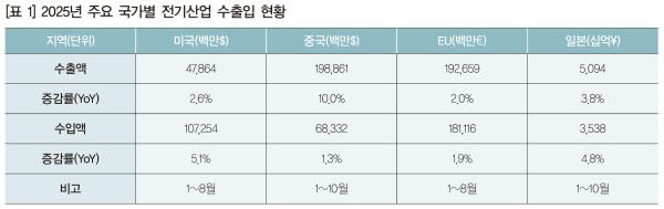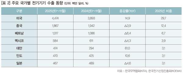 ’25³â ±¹³» Àü±â±â±â ¼öÃâÀº ’24³â ´ëºñ 6.0% Áõ°¡ÇÑ 165¾ï ´Þ·¯·Î Ãß»êµÇ¾ú´Ù. ÁÖ¿ä ¼öÃâ Áõ°¡Ç°¸ñ(¹é¸¸ ´Þ·¯, YoY %)Àº °í¾Ð¹èÀü¹Ý(128, 66.6), ÇÁ·Î±×·¥ÀÌ °¡´ÉÇÑ Á¦¾î±â(213, 59.3), ¿£Áø°áÇÕ¹ßÀü¼¼Æ®(489, 26.8), À¯ÀÔ½Ä º¯¾Ð±â(2,042, 22.8), ¹«Á¤ÀüÀü¿øÀåÄ¡(34, 19.9) µîÀ̾ú´Ù. ¼öÃâ °¨¼Òǰ¸ñÀº ž籤 ¸ðµâ(47, ¡â61.0), ÀιöÅÍ(119, ¡â38.3), ¹ßÀü±â ºÎºÐǰ(44, ¡â69.9), ¾ÖÀÚ(11, ¡â30.5), º¯¼º±â(17, ¡â22.5), °Ç½Ä º¯¾Ð±â(260, ¡â10.2) µîÀ̾ú´Ù.
