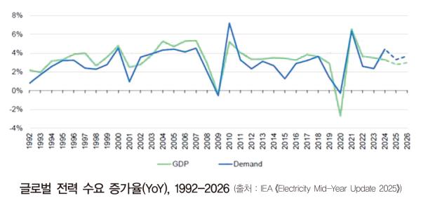’25³â ±Û·Î¹ú Àü·Â ¼ö¿ä´Â ¹Ì±¹Û¡ ¹«¿ª °ü¼¼·Î ÀÎÇÑ ±Û·Î¹ú °æÁ¦Àü¸Á¿¡ ´ëÇÑ ºÒÈ®½Ç¼ºÀÌ ³ô¾ÆÁö¸é¼ ’24³â ´ëºñ Àü·Â ¼ö¿ä Áõ°¨·ü(YoY %)ÀÌ 4.4% Ç϶ôÇß´Ù. Áö³ÇØ ¹Ì±¹Àº °æÁ¦ ¼ºÀå, µ¥ÀÌÅͼ¾ÅÍ È®Àå, Àü±âÈ µî¿¡ ÈûÀÔ¾î »ó¹Ý±â Àü·Â ¼ö¿ä°¡ ’24³â ´ëºñ 2.7% Áõ°¡ÇßÀ¸¸ç, ¿¬Æò±Õ 2.3% Áõ°¡ÇÒ °ÍÀ¸·Î Àü¸ÁµÈ´Ù. Áß±¹ÀÇ Àü·Â ¼ö¿ä´Â 5.0% Áõ°¡ÇßÀ¸¸ç, ’25³â »ó¹Ý±â Áß±¹ °æÁ¦ ¼ºÀå µÐÈ(3.7% YoY)¿Í ´õºÒ¾î ¹Ì-Áß °ü¼¼ ¿µÇâÀ¸·Î ÀÎÇÑ »ê¾÷ ºÎ¹® ¼ö¿ä°¡ µÐÈÇß´Ù. À¯·´¿¬ÇÕ(ÀÌÇÏ EU)ÀÇ Àü·Â ¼Òºñ´Â ’25³â »ó¹Ý±â¿¡ 1% ¹Ì¸¸À¸·Î Áõ°¡Çߴµ¥, ’24³â ´ëºñ ¿¬°£ Àü·Â ¼Òºñ Áõ°¡À²µµ 1.1% Áõ°¡Çß´Ù.
