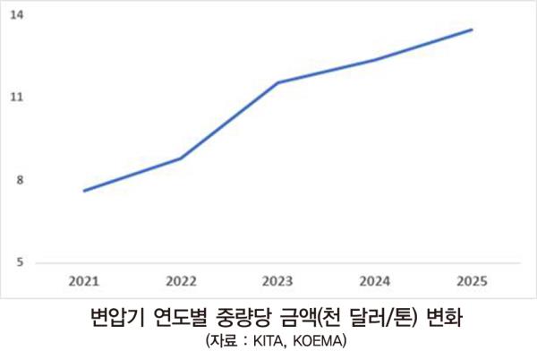 ´Ù¸¸, ¹èÀü¿ë º¯¾Ð±â´Â ¼³ºñ ÅõÀÚ ¹× Á¦Á¶±â¼ú Ãø¸é¿¡¼ Ãʰí¾Ð º¯¾Ð±â(¼Û·º¯Àü¿ë) ´ëºñ ÁøÀÔÀ庮ÀÌ ³·°í ½ÃÀå Âü¿©ÀÚ°¡ ¸¹Àº Ư¼ºÀ» º¸ÀδÙ. ÃÖ±Ù ¹Ì±¹ ½ÃÀåÀÇ Àü·Â±â±â ¼ö¿ä Áõ°¡¿Í ¸Â¹°·Á ±¹³»¿Ü ¹èÀü¿ë º¯¾Ð±â ¾÷üµéÀÌ °¡°ÝÀ» ³·Ãç ½ÃÀå ÁøÀÔÀ» È®´ëÇÏ¸é¼ ¼öÁÖ °æÀïÀÌ ½Éȵǰí ÀÖ´Ù. »Ó¸¸ ¾Æ´Ï¶ó Hitachi Energy, WEG TRANSFORMERS USA, EATON µî ±Û·Î¹ú ±â¾÷µéµµ ¹Ì±¹ ³» º¯¾Ð±â »ý»ê´É·ÂÀ» È®´ëÇϰí ÀÖÀ¸¸ç °ü·Ã ÅõÀÚ ±Ý¾×µµ ´Ã°í ÀÖ´Ù. µû¶ó¼ ±â¾÷µéÀº Àü·Â½ÃÀåÀÇ Æ¯¼º°ú °æÀïüÁ¦¿¡ À¯¿¬ÇÏ°Ô ´ëÀÀÇÒ ¼ö ÀÖ´Â ¹æ¾È°ú Àü·«À» Àß ÁغñÇØ¾ß ÇÒ °ÍÀ¸·Î º¸ÀδÙ.