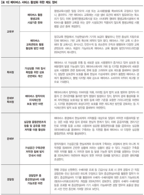 ÀÌ¿¡ °ú±âÁ¤ÅëºÎ´Â Áö³ 2022³â 5¿ùºÎÅÍ »ê·Çз¿¬·°ü Çù¾÷ü°è4)¸¦ ±¸ÃàÇÏ¿© ¸ÞŸ¹ö½º ±â¼ú·¼ºñ½ºÀÇ Æ¯Â¡°ú ¿¬°üµÈ ±ÔÁ¦À̽´¸¦ ºÐ¼®Çß´Ù. ½Å»ê¾÷ Ư¼ºÀ» °í·ÁÇÏ¿© ‘¼±Çã¿ë-ÈıÔÁ¦’¸¦ ¿øÄ¢À¸·Î ÇÏ´Â Æ÷°ýÀû ³×°ÅƼºê ±ÔÁ¦Ã¼°è¿¡ µû¶ó ¹Î°£ Áß½ÉÀÇ ‘ÀÚÀ²±ÔÁ¦’, Ãʱâ´Ü°èÀÎ »ê¾÷ ¿©°ÇÀ» °í·ÁÇÑ ‘ÃÖ¼Ò±ÔÁ¦’, ±â¼ú·¼ºñ½ºÀÇ ¹ßÀüÀ» ÀúÇØÇÏÁö ¾Êµµ·Ï Çϱâ À§ÇÑ ‘¼±Á¦Àû ±ÔÁ¦Çõ½Å’À̶ó´Â ¼¼ °¡Áö ±âº»¿øÄ¢À» ¼¼¿ü´Ù. ±×¸®°í ÇâÈÄ ±â¼ú·¼ºñ½º ¹ßÀü ½Ã³ª¸®¿À¸¦ ¿¹ÃøÇÏ¿© ºÐ¾ßº° ±ÔÁ¦°³¼± °úÁ¦¸¦ ¹ß±¼Çϰí, ¡ã±âÁ¸ ±ÔÁ¦ ¿ÏÈ, ¡ã±ÔÀ² °ø¹é ÇØ¼Ò, ¡ãÇØ¼® À¯¿¬È, ¡ãÁö¿ø±Ù°Å ¸¶·Ã µî ³× °¡Áö À¯ÇüÀÇ ±ÔÁ¦°³¼± ¹æÇâÀ» Á¦½ÃÇß´Ù. ÀÌ·¯ÇÑ °úÁ¤À» °ÅÃÄ ÃÖÁ¾ÀûÀ¸·Î ¹ü ºÐ¾ß¿¡ °øÅëÀûÀ¸·Î Àû¿ëµÇ´Â °úÁ¦ 15°³¿Í ¿£ÅÍÅ×ÀÎ¸ÕÆ®·¹®È, ±³À°, ±³Åë, µðÁöÅÐ °Å·¡·À¯Åë, ±ÝÀ¶, °ø°ø µî ºÐ¾ßº°·Î Àû¿ëµÇ´Â °úÁ¦ 15°³¸¦ Æ÷ÇÔÇØ ÃÑ 30°³ÀÇ ±ÔÁ¦°³¼± °úÁ¦¸¦ È®Á¤Çß´Ù.