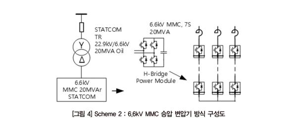 1.2. 6.6kV MMC + ½Â¾Ð º¯¾Ð±â ¹æ½Ä (Scheme 2) ¢º±¸¼º ¿ø¸® : 6.6kV MMC¿Í 6.6kV/22.9kV ½Â¾Ð º¯¾Ð±â¸¦ Á¶ÇÕÇÏ¿© °èÅë¿¡ ¿¬°áÇÏ´Â ¹æ½ÄÀÌ´Ù. [±×¸² 4] ¢ºÆ¯Â¡ ¹× Æò°¡ : ÀÌ ¹æ½ÄÀº ±â¼úÀû ¼º¼÷µµ°¡ ³ô°í, º¯¾Ð±â¸¦ ÅëÇÑ ½Ã½ºÅÛ Àý¿¬ ¹× º¸È£¿¡ ¿ëÀÌÇÏ´Ù´Â ÀåÁ¡ÀÌ ÀÖ´Ù. ÀÀ´ä ¼Óµµ ¹× Ãâ·Â ǰÁúÀº ¿ì¼öÇϳª(1.5% THD), º¯¾Ð±â¿¡¼ ¹ß»ýÇÏ´Â 1~2%ÀÇ Ãß°¡ÀûÀÎ ¼Õ½Ç·Î ÀÎÇØ ½Ã½ºÅÛ È¿À²ÀÌ ¾à 96.5~97.5%·Î ÀúÇϵȴÙ. ÀÌ´Â Scheme 1 ´ëºñ ¿¬°£ ¿î¿µºñ Áõ°¡·Î À̾îÁö¸ç, °í°¡ÀÇ ½Â¾Ð º¯¾Ð±â°¡ Ãß°¡µÇ¸é¼ Ãʱâ ÅõÀÚºñ ¿ìÀ§¸¦ »ó½ÇÇÑ´Ù. Àü¹ÝÀûÀÎ Ãʱâ ÅõÀÚºñ¿ëÀº ±ÕÇüÀûÀÎ ¼öÁØÀ¸·Î Æò°¡µÈ´Ù.
