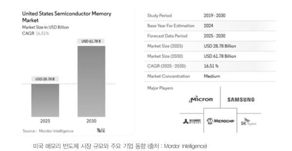 ½ÃÀåÁ¶»ç Àü¹®±â°ü <Mordor Intelligence>°¡ ’24³â 7¿ù¿¡ ¹ßÇ¥ÇÑ º¸°í¼¿¡ µû¸£¸é, ¹Ì±¹ ¸Þ¸ð¸® ¹ÝµµÃ¼ ½ÃÀåÀÇ ±Ô¸ð´Â ’25³â ¾à 287¾ï8õ¸¸ ´Þ·¯¿¡ À̸¦ °ÍÀ¸·Î ÃßÁ¤µÇ¸ç, ’30³â¿¡´Â ¾à 617¾ï8õ¸¸ ´Þ·¯¿¡ ´ÞÇÒ °ÍÀ¸·Î ¿¹»óµÈ´Ù. ºÎ¹®º°·Î´Â DRAMÀÌ ¾à 51%ÀÇ ½ÃÀå Á¡À¯À²·Î °¡Àå Å« ºñÁßÀ» Â÷ÁöÇϰí, ±× µÚ¸¦ À̾î NAND Ç÷¡½Ã ¸Þ¸ð¸®°¡ ¾à 30%, SRAM°ú MRAMÀÌ ¾à 12%, ±âŸ ¸Þ¸ð¸® Á¦Ç°ÀÌ ¾à 7%¸¦ Â÷ÁöÇÑ´Ù.