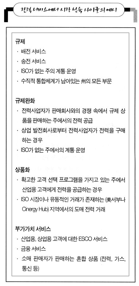 1. ±ÔÁ¦ÀÌ ´Ü°è´Â »óǰÀÌ Àü´ÞµÇ´Â °úÁ¤¿¡¼ ±ÔÁ¦°¡ Áö¹èÇÏ°í °æÀïÀÌ Á¸ÀçÇÏÁö ¾ÊÀº »óÅ·ΠƯ¡ÁöÀ» ¼ö ÀÖ´Ù. °Å·¡´Â ÀϹÝÀûÀ¸·Î ¸Å¿ì ±¸Á¶ÈµÇ¾î ÀÖ°í ±â°£µµ Àå±âÀÌ´Ù. °¡°ÝÀº °íÁ¤µÇ¾î ÀÖ°í ÆÇ¸ÅÀÚ¿Í ±¸¸ÅÀÚ°¡ ºñ±³Àû ÀûÀ¸¸ç ½ÃÀåÀÇ ÁøÀÔÀ庮ÀÌ »ó´çÈ÷ ³ô´Ù. ¼öÁ÷ÀûÀ¸·Î ÅëÇÕµÈ Àü·Â»ç¾÷ÀÚ°¡ ½ÃÀåÀ» Áö¹èÇÏ¸ç °í°´ÀÇ ¼±ÅñÇÀº Á¦ÇÑÀûÀÌ´Ù. °¡°ÝÀº ÃѰý¿ø°¡¸¦ ±âº»À¸·Î Çϰí ÀÖ¾î º¯È°¡ °ÅÀÇ ¾ø°Å³ª ¾Æ¿¹ ¾øÀ¸¸ç, ÀÎÇÁ¶ó³ª »õ·Î¿î °Í¿¡ ´ëÇÑ ÅõÀÚ °áÁ¤Àº ±ÔÁ¦ÀÚÀÇ Áö¿ø¿¡ µû¶ó Å« ¿µÇâÀ» ¹Þ´Â´Ù. 1992³â Àü¿¡´Â ¹Ì±¹ÀÇ ¸ðµç Àü·Â»ê¾÷ÀÌ ±ÔÁ¦´Ü°è¿¡ ÀÖ¾ú´Ù. Àü·Â »ç¾÷ÀÚ È¤Àº À¯±âÀûÀ¸·Î °áÇÕµÈ ¹ßÀü »ç¾÷ÀÚµéÀÌ ¸ðµç ¹ßÀü, ¼ÛÀü, ¹èÀü ½Ã¼³À» ¼ÒÀ¯Çϰí ÅëÀÏµÈ °èÅëÀ» ¿î¿µÇÏ¿´´Ù. °í°´Àº Áö¿ª Àü·Â»ç¾÷ÀڷκÎÅÍ Àü±â¸¦ »ç´Â °Í ¿Ü¿¡´Â ¼±ÅñÇÀÌ °ÅÀÇ ¾ø¾ú´Ù.2. ±ÔÁ¦¿ÏȱÔÁ¦¿ÏÈ ´Ü°è¿¡¼´Â ÀϺΠºÎ¹®¿¡¼ ±ÔÁ¦°¡ ¿ÏÈµÇ°í ½ÃÀå¿¡ °æÀïÀÌ µµÀ﵃ ¼ö ÀÖµµ·Ï ÁøÀÔÀ庮ÀÌ ¾ø¾îÁö°Ô µÈ´Ù. °æÀïÀÚÀÇ ¼ö°¡ Áõ°¡ÇÔ¿¡ µû¶ó °Å·¡´Â ´õ¿í À¯¿¬ÇØÁö°í °í°´Àº °æÀï°ú ´Ã¾î³ ¼±ÅñÇÀ» ÅëÇØ ÀÌÀÍÀ» ÃëÇÏ·Á ÇÑ´Ù. ±ÔÁ¦´Â ¿©ÀüÈ÷ °Å·¡¹æ½ÄÀÇ ¸¹Àº ºÎ¹®À» ÅëÁ¦ÇÏ°Ô µÇÁö¸¸ ÀÌ´Â °³¹æµÈ ºÎ¹®¿¡¼ °æÀïÀÌ ÃËÁøµÉ ¼ö ÀÖµµ·Ï Çϱâ À§ÇÑ °ÍÀÌ´Ù. °æÀïÀÌ µµÀÔµÈ ºÎ¹®(¾Æ¸¶ ¹ßÀüÀ̳ª µµ¸Å, ¼Ò¸ÅÆÇ¸ÅºÎ¹®ÀÏ °ÍÀÌ´Ù)¿¡¼ÀÇ ¼ºñ½º´Â ´õ ´Ù¾çÇØÁö¸ç °í°´¿¡°Ô ¸Â´Â ¸ÂÃã ¼ºñ½º°¡ °¡´ÉÇØÁø´Ù. ¼ÛÀü°ú ¹èÀüÀÇ °¡°ÝÀº ÃѰý ¿ø°¡ÁÖÀÇ ±ÔÁ¦¹æ½ÄÀ¸·Î ³²¾ÆÀÖÁö¸¸ È¿À²¼ºÀ» Áõ´ë½Ã۱â À§ÇØ Àμ¾Æ¼ºê ¿ä±ÝÁ¦°¡ äÅõDZ⵵ ÇÑ´Ù.3. »óǰȽÃÀåÀÇ ¼º¼÷ »çÀÌŬ Áß »óÇ°È ´Ü°è¿¡ À̸£¸é °æÀïÀÌ ¿ÏÀüÈ÷ »Ñ¸®³»¸®°Ô µÈ´Ù. ¸¹Àº ½ÃÀå Âü¿©ÀÚµéÀÌ ¼·Î °æÀïÇÏ°í °Å·¡·®Àº ¸¹¾ÆÁø´Ù. °¡°ÝÀº ½ÃÀå¿¡ µû¶ó º¯ÈÇϸç À¯µ¿ÀûÀÌ´Ù. ±ÔÁ¦´Â ÁÖ·Î ½ÃÀå Á¶ÀÛÀ» ¹æÁöÇÏ°í µ¶Á¡ ÀÎÇÁ¶ó¿¡ ´ëÇÑ Á¢±ÙÀ» °øÁ¤ÇÏ°Ô Çϴµ¥ ÀÖ´Ù. °Å·¡´Â ´Ü¼øÈµÇ°í ¸ÅµµÀÚ¿Í ¸Å¼öÀÚ °£ ¾çµµ°¡ °¡´ÉÇϸç À§ÇèÀ» °ü¸®Çϱâ À§ÇØ ±ÝÀ¶½ÃÀåÀÌ »ý°Ü³´Ù. °ú°Å ¾Æ´Â »ç¶÷³¢¸® ÀüÈ·Î ÀÌ·ïÁ³´ø °Å·¡´Â ÀÌÁ¦ ÀüÇô ¸ð¸£´Â ¸ÅµµÀÚ¿Í ¸Å¼öÀÚµé »çÀÌ¿¡¼ ÀüÀÚÀûÀ¸·Î ÀÌ·ïÁö°Ô µÈ´Ù. ¹ßÀü½Ã¼³ °°Àº ÀÎÇÁ¶ó¿¡ ´ëÇÑ ÅõÀÚ ÀÌÀÍÀº ¿ÀÁ÷ ½ÃÀå ¼ö¿ä¿¡ ÀÇÇØ °áÁ¤µÈ´Ù. °æÀïȸ»çÀÇ ÁÖÁÖµéÀº °æ¿µ»óÀÇ À߸øµÈ °áÁ¤¿¡ ´ëÇÑ À§ÇèÀ» °¨¼öÇÏ°Ô µÈ´Ù. ¹ßÀü¼Ò°¡ °Ç¼³µÇ´Âµ¥ ½ÃÀåÁ¶°ÇÀÌ ±× ºñ¿ëÀ» °¨´çÇϱ⿡ ÃæºÐÄ¡ ¾ÊÀ» ¶§, ¹ßÀüȸ»çÀÇ ÁÖÁÖ³ª ä±ÇÀÚ À̿ܿ¡´Â ¾Æ¹«µµ ±× ºñ¿ëÀ» ¶°¾ÈÁö ¾Ê´Â´Ù. »óÇ°È ´Ü°è¿¡¼´Â °¡°Ý Åõ¸í¼ºÀÌ Á¸ÀçÇÏ°Ô µÇ¸ç, »ç°íÀÚ ÇÏ´Â ¸Å¼öÀÚ¿Í ÆÈ°íÀÚ ÇÏ´Â ¸ÅµµÀÚÀÇ °Å·¡¸¦ ¹æÇØÇÏ´Â À庮ÀÌ »ç¶óÁø´Ù. ¶ÇÇÑ ¾î´À ´©±¸µµ ½ÃÀå Áö¹è·ÂÀ» °¡Áú ¼ö ¾øÀ¸¸ç ±ÔÁ¦¸¦ ÅëÇÑ º¸È£µµ »ç¶óÁö°Ô µÈ´Ù.4. ºÎ°¡°¡Ä¡ ¼ºñ½º½ÃÀåÀÇ ¼º¼÷ »çÀÌŬ Áß ¸¶Áö¸· ´Ü°è¿¡ À̸£¸é Âü¿©ÀÚµéÀº °í°´ÀÌ °¡Ä¡ ÀÖ´Ù°í »ý°¢ÇÏ´Â ¼ºñ½º¸¦ »óǰ ÆÇ¸Å¿¡ ºÎ°¡ÇÔÀ¸·Î½á ºÎ°¡°¡Ä¡¸¦ ½ÇÇöÇÏ·Á ³ë·ÂÇÑ´Ù. ¸¹Àº °æ¿ì, ½ÃÀåÀÌ ¼º¼÷ÇÏ¸é »óǰÀÇ ¼öÀÍÀÌ ¹ÚÇØÁö±â ¶§¹®¿¡ ÆÇ¸ÅÀÚ´Â ÀÌÀÍÀ» Áõ´ë½Ã۱â À§ÇØ °í°´Áß½ÉÀÇ ¼ºñ½º¸¦ ¹ßÀü½ÃÄѾ߸¸ ÇÑ´Ù. ¹èÀü¸ÁÀ» ÅëÇØ Àü¼ÛµÇ´Â 1kWÀÇ Àü·ÂÀº ´Ù¸¥ °Í°ú µ¿ÀÏÇϱ⠶§¹®¿¡ ºÎ°¡°¡Ä¡¼ºñ½º¸¦ Á¦°øÇÏ´Â °ÍÀÌ ½ÃÀåÁ¡À¯À²À» Áõ´ë½ÃŰ´Â ÃÖ»óÀÇ ¹æ¹ýÀÎ °ÍÀÌ´Ù. ¼Ò¸Å Àü·Â½ÃÀå¿¡¼ ´ëºÎºÐÀÇ ÆÇ¸ÅÀÚ´Â ¾Ë¸ÂÀº ½ÃÀåÁ¡À¯À²°ú ÀÌÀÍÀ» ¾ò±â À§ÇØ ºÎ°¡°¡Ä¡¼ºñ½º¿¡ ÀÇÁ¸ÇÒ ¼ö¹Û¿¡ ¾ø´Ù. °¡°ÝÀ» ³·Ãß´Â °Í¸¸À¸·Î´Â ½ÃÀå¿¡¼ÀÇ À§Ä¡¸¦ À¯ÁöÇϴµ¥ ÃæºÐÄ¡ ¾Ê´Ù.