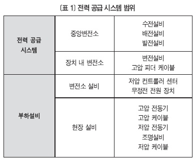 ¢º Àü·Â °ø±Þ ½Ã½ºÅÛ°ú ½Ã½ºÅÛÀÇ ¿Â¶óÀÎ Áø´Ü °øÀå Àü±â¼³ºñ´Â Àü·Â °ø±Þ ½Ã½ºÅÛ°ú ºÎÇÏ ¼³ºñ·Î ³ª´©¾îÁø´Ù. <Ç¥ 1>Àº Àü·Â °ø±Þ ½Ã½ºÅÛÀÇ ¹üÀ§¸¦ ³ªÅ¸³½ °ÍÀÌ´Ù. ÀÌ·± º¹¼öÀÇ ºÎÀ§ ¹× ±âÁ¾, ¼³ºñ¸¦ ¿Â¶óÀÎÀ¸·Î °¨½Ã Áø´ÜÀ» ÇÒ ¼ö ÀÖ´Â °ÍÀ» ½Ã½ºÅÛ ¿Â¶óÀÎ Áø´ÜÀ̶ó°í ÇÑ´Ù.