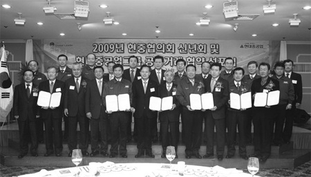 Çö´ëÁß°ø¾÷ÀÌ ¡®2009 ÇöÁßÇùÀÇȸ ½Å³âȸ ¹× Çö´ëÁß°ø¾÷±×·ì °øÁ¤°Å·¡ Çù¾à ¼±Æ÷½Ä¡¯À» °¡Á³´Ù.(¿ÞÂÊ ´Ù¼¸¹øÂ°ºÎÅÍ Çö´ëÁß°ø¾÷ Ãֱ漱 »çÀå, °øÁ¤°Å·¡À§¿øÈ¸ ¹é¿ëÈ£ À§¿øÀå, ÇÏÀÌ¿¡¾îÄÚ¸®¾Æ ±è±Ù¹è ´ëÇ¥, Çö´ë¹ÌÆ÷Á¶¼± ¼ÛÀ纴 »çÀå, ¼¼ÁøÁß°ø¾÷ À±Á¾±¹ ´ëÇ¥, Çö´ë»ïÈ£Áß°ø¾÷ Ȳ¹«¼ö »çÀå, ¼¼ÀÏÁß°ø¾÷¾ÈÀ籤´ëÇ¥) |