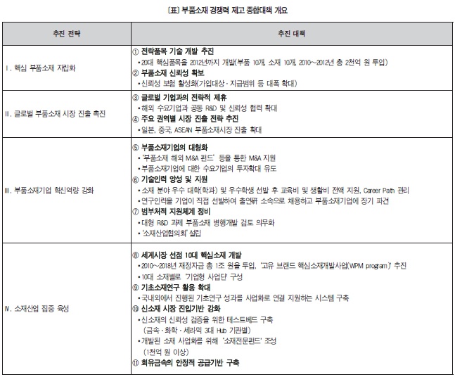 Á¤ºÎ´Â 2018³â ±îÁö ¡®¼¼°è 4´ë ºÎǰ¼ÒÀç °±¹¡¯ÁøÀÔÀ» À§ÇÑ Ã»»çÁøÀ» ¸¶·ÃÇß´Ù. ÇöÀç ¼±Áø±¹ ´ëºñ 60% Á¤µµÀÎ ÇٽɼÒÀç ±â¼ú ¼öÁØÀ» 2018³â±îÁö 90% ¼öÁØÀ¸·Î ²ø¾î¿Ã¸®°í, À̸¦ ÅëÇØ 2008³â 1,835¾ï ´Þ·¯ ¼öÁØÀÇ ºÎǰ¼ÒÀç ¼öÃ⠱Ը𸦠2018³â±îÁö 5,000¾ï ´Þ·¯ ¼öÁØÀ¸·Î Å©°Ô È®´ëÇØ ºÎǰ¼ÒÀç»ê¾÷À» ¼öÃâ°ú ºÎ°¡°¡Ä¡ âÃâÀÇ ÁÖ¿ªÀ¸·Î ¹ßÀü½ÃÄÑ ³ª°¥ °èȹÀÌ´Ù. Áö½Ä°æÁ¦ºÎ(Àå°ü ÃÖ°æÈ¯)´Â 10¿ù 29ÀÏ Á¦35Â÷ ºñ»ó°æÁ¦´ëåȸÀÇ(¼ÒÀç»ê¾÷ Áß½É) ¹× 11¿ù 12ÀÏ Á¦37Â÷ ºñ»ó°æÁ¦´ëåȸÀÇ(ºÎǰ¼ÒÀç»ê¾÷Àü¹Ý)¿¡¼ 2Â÷·Ê ³íÀÇµÈ ³»¿ëÀ» Åä´ë·Î ¡®ºÎǰ¼ÒÀç °æÀï·Â Á¦°í Á¾ÇÕ´ëÃ¥¡¯À» È®Á¤ ¡¤ ¹ßÇ¥Çß´Ù. È®Á¤µÈ Á¾ÇÕ´ëÃ¥¿¡ µû¸£¸é, Á¤ºÎ´Â ¡ã ÇÙ½É ºÎǰ¼ÒÀç ÀÚ¸³È ¡ã ±Û·Î¹ú ºÎǰ¼ÒÀç ½ÃÀå ÁøÃâ ÃËÁø ¡ã ºÎǰ¼ÒÀç±â¾÷ Çõ½Å¿ª·® °È ¡ã ¼ÒÀç»ê¾÷ ÁýÁß À°¼º µî 4´ë ÃßÁø Àü·«À» Áß½ÉÀ¸·Î ¼¼°è½ÃÀå ¼±Á¡ 10´ë ÇٽɼÒÀç °³¹ß µî 11°³ ÃßÁø ´ëÃ¥À» 2018³â±îÁö ÃßÁøÇØ ³ª°¥ ¹æÄ§ÀÌ´Ù. ´ëÃ¥ÀÇ ÁÖ¿ä³»¿ëÀ» »ìÆìº¸¸é, ¸ÕÀú ¡®¼±Åðú ÁýÁß¡¯ ¹æ½ÄÀÇ ÇٽɺÎǰ¼ÒÀç ÀÚ¸³ÈÀÌ´Ù. ÇöÀç ±â¾÷µéÀÇ ¼ö¿ä°¡ ¸¹°Å³ª ¹Ì·¡ ¼ö¿ä ±ÞÁõÀÌ ¿¹»óµÇ´Â 20´ë ÇÙ½É ºÎǰ¼ÒÀçÀÇ ÀÚ¸³È¸¦ À§ÇÑ ±â¼ú °³¹ß¿¡ ¸ÅÁøÇÑ´Ù´Â °ÍÀÌ´Ù. 20´ë ǰ¸ñÀº ±â¾÷ ¼ö¿äÁ¶»ç¸¦ °ÅÃÄ 2010³â 1¿ù ¡®ºÎǰ¼ÒÀç¹ßÀüÀ§¿øÈ¸¡¯¿¡¼ È®Á¤ ÇÒ °èȹÀÌ´Ù. Àü ǰ¸ñÀ» ºÎǰ¼ÒÀç±â¾÷°ú ¼ö¿ä±â¾÷ °£ÀÇ °øµ¿ R&D ¹æ½ÄÀ¸·Î ÃßÁøÇØ R&D °á°ú¸¦ ¼ö¿ä±â¾÷ ±¸¸Å·Î ¿¬°áÇÒ ¿¹Á¤À̸ç, °úÁ¦´ç Á¤ºÎ Áö¿ø ±Ô¸ð¸¦ ÇöÀçÀÇ 2¹è ±Ô¸ð(30¾ï ¿ø)·Î ´Ã¸®°í, 2012³â±îÁö ÃÑ 2,000¾ï ¿øÀ» ÅõÀÔÇÑ´Ù. ¶ÇÇÑ ¼öÃ⺸Çè°ø»çÀÇ ½Å·Ú¼º º¸ÇèÀ» ´ëÆø È®´ëÇØ »õ·Î °³¹ßµÈ ºÎǰ¼ÒÀ縦 ¼ö¿ä±â¾÷ÀÌ ¾È½ÉÇϰí Ȱ¿ëÇϵµ·Ï Áö¿øÇÒ °èȹÀÌ´Ù. ºÎǰ¼ÒÀçÀÇ ±Û·Î¹ú ½ÃÀå ÁøÃâ ÃËÁøÃ¥À¸·Î, ±Û·Î¹ú ±â¾÷µéÀÇ °³¹æÇü ±â¼ú Çõ½Å(Open Innovation) Àü·«À» Ȱ¿ëÇØ ±¹³» ºÎǰ¼ÒÀç±â¾÷°ú ±Û·Î¹ú ±â¾÷ °£ÀÇ Àü·«Àû Á¦ÈÞ¸¦ °ÈÇØ ³ª°¥ °èȹÀÌ´Ù. À̸¦ À§ÇØ 2010³â 400¾ï ¿øÀÌ Áö¿øµÈ´Ù. ¾Æ¿ï·¯ ÀϺ», Áß±¹, ASEAN µî ÁÖ¿ä±Ç¿ªº° ½ÃÀåÁøÃâÀü·«À» ÃßÁøÇÑ´Ù. ºÎǰ¼ÒÀç±â¾÷ÀÇ Çõ½Å ¿ª·® °È¿¡µµ ¾ÕÀå¼ M&A ¹× ÇØ¿Ü Á÷Á¢ÅõÀÚ À¯Ä¡¸¦ Áö¿øÇØ ºÎǰ¼ÒÀç±â¾÷ÀÇ ´ëÇüȸ¦ À¯µµÇØ ³ª°¥ °èȹÀÌ´Ù. ƯÈ÷ »ê¾÷ÀºÇà µîÀÌ Âü¿©ÇÏ´Â ¡®ºÎǰ¼ÒÀç ÇØ¿Ü M&A ÆÝµå¡¯¸¦ Ȱ¿ëÇØ ÇØ¿Ü ±â¾÷°úÀÇ M&A¸¦ Áö¿øÇÑ´Ù. ¼ö¿ä±â¾÷ÀÇ ºÎǰ¼ÒÀç±â¾÷¿¡ ´ëÇÑ ÅõÀÚ È®´ë¸¦ À¯µµÇϱâ À§ÇØ ¼ö¿ä±â¾÷ÀÇ ÅõÀÚ¿Í Á¤ºÎÀÇ R&D Áö¿øÀ» ¿¬°èÇÏ´Â ¡®¼ö¿ä±â¾÷ÅõÀÚ¿¬°èÇü ±â¼ú °³¹ß »ç¾÷¡¯À» 2010³âºÎÅÍ Âø¼öÇÑ´Ù. ¶ÇÇÑ ±Û·Î¹ú ¼ö¿ä±â¾÷°ú ¿¬°èµÈ ÇØ¿Ü ¡®±â¾÷ º¥Ã³ ijÇÇÅ»(Corporate Venture Capital)¡¯ÀÇ ±¹³»ÅõÀÚÀ¯Ä¡ Ȱµ¿À» Àü°³, ±¸¹Ì, Æ÷Ç×, ÀÍ»ê, ºÎ»ê, ÁøÇØ µî ºÎǰ¼ÒÀç Àü¿ë°ø´Ü¿¡ ÀϺ»°ú µ¶ÀÏ ºÎǰ¼ÒÀç±â¾÷À» Áß½ÉÀ¸·Î ÅõÀÚÀ¯Ä¡¸¦ ÃßÁøÇÑ´Ù. ƯÈ÷ ºÎǰ¼ÒÀç ±â¼úÀηÂÀÇ ¾ç¼º ¹× Áö¿øÀÌ ´ëÆø °ÈµÈ´Ù. ÈÇÐ, Àç·á, ±Ý¼Ó µî ¼ÒÀç°ü·Ã Çаú¸¦ Áß½ÉÀ¸·Î ¿ì¼ö´ëÇÐ ¹× ¿ì¼öÇлýÀ» ¼±Á¤ÇØ ±³À°´Ü°èºÎÅÍ ÁýÁß Áö¿øÇϰí Á¹¾÷ ÈÄ ¡®Career Path¡¯¸¦ Ưº° °ü¸®ÇÒ °èȹÀÌ´Ù. 2010³â »ó¹Ý±â¿¡ Èñ¸Á ´ëÇÐÀ» ´ë»óÀ¸·Î 4~5°³ ´ëÇÐ(Çаú), ¾à 100¸íÀÇ ÇлýÀ» ¼±¹ßÇØ ÇϹݱâºÎÅÍ ¼±¹ß Çлý¿¡ ´ëÇØ ±³À°ºñ ¹× »ýȰºñ Àü¾×À» Áö¿øÇϰí 2011³â ºÎÅÍ Áö¿ø´ë»óÀ» Á¡Â÷ È®´ëÇÑ´Ù. Áß¼Ò ¡¤ Áß°ß ºÎǰ¼ÒÀç±â¾÷ÀÇ ¿¬±¸Àη ºÎÁ· Çö»óÀ» ÇØ¼ÒÇϱâ À§ÇØ Ã⿬¿¬±¸±â°üÀÇ ¿¬±¸ÀηÂÀ» ºÎǰ¼ÒÀç ±â¾÷¿¡ Àå±â°£ ÆÄ°ßÇÏ´Â Á¦µµµµ ³»³âºÎÅÍ ½Ç½ÃµÈ´Ù. ¿¬±¸ÀηÂÀ» ºÎǰ¼ÒÀç±â¾÷ÀÌ Á÷Á¢ ¼±¹ßÇØ Ã⿬æÚ¼Ò¼ÓÀ¸·Î ä¿ëÇϰí, À̵éÀ» ÇØ´ç ±â¾÷¿¡ ÃÖ¼Ò 3³â ÀÌ»ó Àå±â ÆÄ°ßÇÑ´Ù. ÆÄ°ßÀη ÀΰǺñÀÇ 70%¸¦ Á¤ºÎ¿¡¼ ºÎ´ãÇϰí, 2010³â 200¸íÀ» ½Ã¹üÀûÀ¸·Î ÆÄ°ßÇÑ µÚ, 2013³â ºÎÅÍ´Â ¿¬°£ 1õ ¸í ±Ô¸ð·Î È®´ë ÇÒ °èȹÀÌ´Ù.