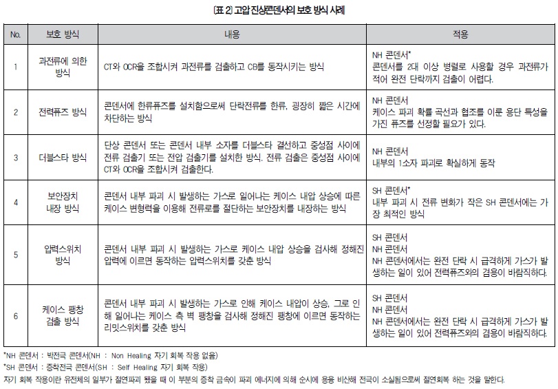 1. °í¾Ð Áø»óÄܵ§¼ ÃÖ±ÙÀÇ °í¾Ð Áø»óÄܵ§¼´Â À¯Àüü Àç·áÀÇ Ç°Áú Çâ»ó ¹× Äܵ§¼ Á¦Á¶°øÁ¤¿¡¼ÀÇ Ç°Áú Çâ»óÀ¸·Î ½Å·Ú¼ºÀÌ º¸´Ù ³ô¾ÆÁö°í º¸¼ö Á¡°ËÀÌ ºñ±³Àû °£´ÜÇÑ Á¤Áö(ð¡ò)±â±â´Ù. Äܵ§¼ ÀÚüÀÇ »ç°í´Â ±ØÈ÷ µå¹°Áö¸¸ Àå½Ã°£ »ç¿ëÇÏ´Ù º¸¸é ¿ì¹ßÀûÀÎ Àý¿¬¿È°¡ ¹ß»ýÇϸç, ¶ÇÇÑ ³»¿ë¿¬¼ö(Ò±éÄ곐겤)¿Í ¼ö¸íÀÌ ÀÖ´Â ÇÑ »ç°í°¡ ÀüÇô ¾ø´Ù°í´Â ÇÒ ¼ö ¾ø´Ù. ±×¸®°í Äܵ§¼¸¦ µÑ·¯½Ñ ȯ°æ ¹× ´Ù¸¥ ±â±â³ª ȸ·Î(°èÅë) Á¶°Ç¿¡¼ÀÇ ÀÌ»ó Çö»óÀÌ ¿äÀÎÀ¸·Î ¹ß»ýÇÏ´Â »ç°í »ç·Êµµ ÀÖ´Ù. ÀÌ·¯ÇÑ °æ¿ì 2Â÷ ÀçÇØ¸¦ ¹æÁöÇϱâ À§ÇØ °¢Á¾ º¸È£ ¹æ½ÄÀÌ ÃëÇØÁö°í ÀÖ´Ù. ÇöÀç ä¿ëµÇ°í ÀÖ´Â º¸È£ ¹æ½ÄÀ» Á¤¸®Çϸé <Ç¥ 2>¿Í °°´Ù.