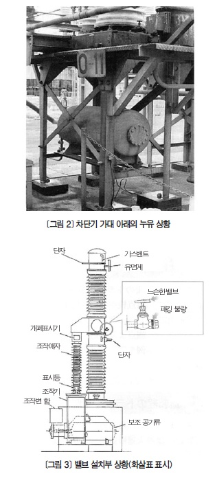 2. ¾ÖÀÚÇü Â÷´Ü±âÀÇ ¹ëºê ´©À¯ Æ®·¯ºí ÃÊ¿©¸§ÀÌ¶ó ¿©°ÜÁú Á¤µµÀÇ ´õÀ§°¡ ã¾Æ¿Â 6¿ù Ãʼø, º¯Àü¼Ò ¿îÀü¿øÀ¸·ÎºÎÅÍ ¼öÀü¿ë º¯¾Ð±âÀÇ Àü¿øÃø Â÷´Ü±â¿¡¼ ±â¸§ÀÌ »õ°í ÀÖ´Ù´Â Å뺸¸¦ ¹Þ¾Ò´Ù. ±ÞÈ÷ ÇöÀåÀ¸·Î ´Þ·Á°¡ º¸´Ï <±×¸² 2>¿Í °°ÀÌÂ÷´Ü±â ÇϺΰ¡ ±â¸§À¸·Î ¿À¼ÕµÅ ÀÖ¾ú´Ù. Á¶»çÇØ º» ¹Ù·Î´Â <±×¸² 3>¿¡ ³ªÅ¸³ ¹ëºêºÎ¿¡¼ ´©À¯°¡ ÀÖ¾ú´Ù.