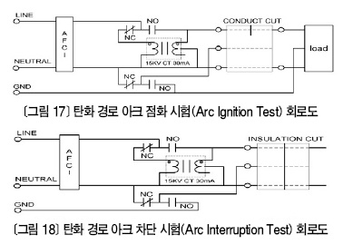 ´öÆ®¸¦ ÀÌ¿ëÇÏ´Â ¹æ¹ýÀº <±×¸² 20>°ú °°ÀÌ µÎ °³ÀÇ È¸·Î¸¦ ÇϳªÀÇ ´öÆ®¿¡ »ðÀÔÇϰí, °¢°¢ÀÇ È¸·Î¿¡ °úÀü·ùÂ÷´Ü±â(MCCB)¿Í ¾ÆÅ©Â÷´Ü±â(AFCI)¸¦ ¼³Ä¡ÇÑ´Ù. °úÀü·ùÂ÷´Ü±â ȸ·Î¿¡ º´·Ä ¾ÆÅ© °íÀå ½ÃÇèÀ» ½Ç½ÃÇÒ °æ¿ì, ¿·¿¡ ¼³Ä¡ÇÑ ¾ÆÅ©Â÷´Ü±â¿¡ ¿µÇâÀÌ ¾ø¾î¾ß ÇÑ´Ù. ½ºÅ×ÀÌÇ÷¯¸¦ ÀÌ¿ëÇÏ´Â ¹æ¹ýÀº <±×¸² 21>°ú °°ÀÌ µÎ °³ÀÇ ÄÉÀ̺íÀ» ÀÏ·Ä·Î ¹è¿Çϰí, ½ºÅ×ÀÌÇ÷¯¸¦ ÀÌ¿ëÇØ 1.22m °£°ÝÀ¸·Î °íÁ¤ÇÑ ÈÄ °¢°¢ÀÇ È¸·Î¿¡ °úÀü·ùÂ÷´Ü±â¿Í ¾ÆÅ©Â÷´Ü±â¸¦ ¼³Ä¡ÇÑ´Ù. °úÀü·ùÂ÷´Ü±â ȸ·Î¿¡¼ º´·Ä ¾ÆÅ© °íÀå ½ÃÇèÀ» ½Ç½ÃÇÒ °æ¿ì, ¿·¿¡ ¼³Ä¡ÇÑ ¾ÆÅ©Â÷´Ü±â¿¡ ¿µÇâÀÌ ¾ø¾î¾ß ÇÑ´Ù. ÄÉÀÌºí ±æÀÌ´Â 7.62m, ½ÃÇè Àü·ù´Â 150A´Ù.