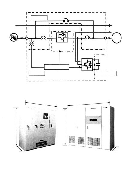 Àú¾Ð±â´Â <±×¸²3>°ú °°ÀÌ Àü±âÀÌÁßÃþ Ä¿ÆÐ½ÃÅÍ ¸ðµâ¿¡ ¼ö³³ÇÑ Ä¿ÆÐ½ÃÅ͹Ý, Àýȯ½ºÀ§Ä¡³ª ÃÊÆÛ¡¤ÀιöÅ͸¦ ¼ö³³ÇÑ º¯È¯±â¹Ý, ÀÔÃâ·Â´ÜÀÚ³ª ÀåÄ¡ÀÇ Á¡°Ë ½Ã µî¿¡ ±ÞÀüÀ» ´Ü¼ÓÇϱâ À§ÇØ ¹ÙÀÌÆÐ½º½ºÀ§Ä¡¸¦ ¼ö³³ÇÑ ÀÔÃâ·Â¹ÝÀ¸·Î ±¸¼ºµÇ¾î ÀÖ´Ù.º»ÀåÄ¡ÀÇ °í¾Ð±â »ç¾çÀ» <Ç¥2>¿¡ ¼¼úÇß´Ù. °í¾Ð±â´Â Àýȯ½ºÀ§Ä¡¿¡ °í¼Ó´ë¿ë·® ¹ÝµµÃ¼¼ÒÀÚ GCT(°ÔÀÌÆ®Àü·ùÇü ÅÏ¿ÀÇÁ»çÀ̸®½ºÅÍ)¸¦ ä¿ëÇÏ´Â °ÍÀ¸·Î 6600V, 2000kVAÀÇ °í¾Ð ´ë¿ë·® ÀåÄ¡ÀÌ¸é¼ Àú¾Ð±â¿Í µ¿ »ç¾çÀÇ »ó½Ã»ó¿ë ±ÞÀü¹æ½ÄÀ» °¡´ÉÇÏ°Ô ÇØ Æò»ó½Ã¿¡ ¿îÀüÈ¿À²ÀÌ 98%ÀÌ»óÀÌ¸é¼ °íÈ¿À²È¸¦ Ãß±¸ÇÏ´Â °ÍÀÌ °¡´ÉÇß´Ù.¶Ç, °í¾Ð±â ¿Ü°üÀ» <±×¸²4>¿¡ ±×·È´Ù. °í¾Ð±â´Â °øÀå °Ç¼³À» ÀϰýÇØ º¸»óÇÏ´Â ¿ëµµÀ̱⠶§¹®¿¡ ÀÚ¸³Çü Æó¼â¹Ý ±¸Á¶·Î ½Ç¿Ü¿¡ ±×´ë·Î ¼³Ä¡ÇÒ ¼ö ÀÖµµ·Ï ÇÑ´Ù.