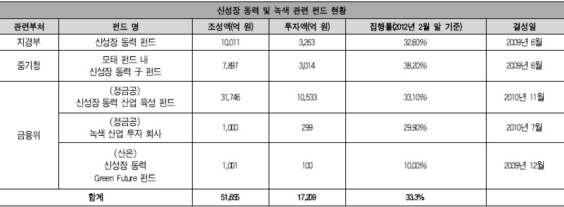 Á¤Ã¥ ±ÝÀ¶ ±â°ü ÆÝµå È®´ë | ³ì»ö ±â¾÷ ÁÖ½Ä, ä±Ç¿¡ ÅõÀÚÇÏ´Â Á¤Ã¥ ±ÝÀ¶ ±â°ü ÆÝµå¸¦ È®´ëÇϱâ·Î Çß´Ù. Á¤Ã¥±ÝÀ¶°ø»çÀÇ ½Å¼ºÀ嵿·Â»ê¾÷À°¼ºÆÝµå¸¦ 2011³â 14°³ 3.2Á¶ ¿ø¿¡¼ 2012³â 18°³ 3.8Á¶ ¿øÀ¸·Î Ãß°¡ Á¶¼ºÇϰí, »ê¾÷ÀºÇà Green Future ÆÝµå ÁýÇà·üÀ» 10%¿¡¼ 50%·Î, Á¤Ã¥±ÝÀ¶°ø»ç ³ì»ö»ê¾÷ÅõÀÚȸ»çÀÇ ÁýÇà·üÀ» 29.9%¿¡¼ 50.0%·Î ³ôÀ̱â·Î Çß´Ù. º¹ÇÕ ±ÝÀ¶ ÇÁ·Î±×·¥ µµÀÔ | Package Finance µµÀÔÀ¸·Î ¼ºÀå °¡´É¼ºÀÌ ÀÖ´Â ³ì»ö ±â¾÷¿¡ ´ëÇÑ ÅõÀÚ¿Í ´ëÃâÀ» µ¿½Ã¿¡ Áö¿øÇϱâ·Î Çß´Ù. Á¤Ã¥ ±ÝÀ¶ ±â°üÀÌ ÀûÇÕÇÑ ±â¾÷À» ¹ß±¼ÇÑ ÈÄ ±â¾÷ »óȲ¿¡ µû¶ó µ¿½Ã ¶Ç´Â ¼øÂ÷ÀûÀ¸·Î ÅõÀÚ¡¤´ëÃâÀ» Áö¿øÇÏ´Â °ÍÀ¸·Î, â¾÷ Ãʱ⠱â¾÷Àº Ãʱâ R&D´Ü°è ÅõÀÚ ½ÃÇà ÈÄ »ç¾÷È ´Ü°è¿¡¼ ´ëÃâÀ» Áö¿øÇÏ°í ¼ºÀå ±â¾÷Àº °³º° ÇÁ·ÎÁ§Æ® »óȲ¿¡ µû¶ó ´ëÃâ ¹× ÅõÀÚ¸¦ ¸ÅĪÇÑ´Ù. ¶ÇÇÑ, Áß¼Ò±â¾÷ûÀº ³ì»ö Áß¼Ò¡¤º¥Ã³±â¾÷¿¡ ´ëÇØ Åõ¡¤À¶ÀÚ º¹ÇÕ ±ÝÀ¶(ÀÌÀÍ °øÀ¯Çü ´ëÃâ, ¼ºÀå °øÀ¯Çü ´ëÃâ) Áö¿øÀ» È®´ëÇϱâ·Î Çß´Ù.