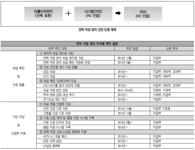 2012³â 10¿ùºÎÅÍ 100§Ò±Þ Àü·Â ÀúÀå ÀåÄ¡¿¡ ´ëÇÑ ÀÚÀ² ¾ÈÀü ÀÎÁõ(KC)Á¦¸¦ ½ÃÇàŰ·Î Çß´Ù. ÇÑÆí, KC¾ÈÀü ÀÎÁõÀ» ½Ã½ºÅÛ(PCS) ºÎºÐ¸¸ Àû¿ëÇϱ⿡ ¸®Æ¬ÀÌÂ÷ÀüÁö¿¡ ´ëÇÑ ¾ÈÀü ÀÎÁõ ±âÁØÀ» º°µµ·Î È®º¸ÇØ¾ß ÇÑ´Ù. ÀÌ¿¡ µû¶ó ´Üü Ç¥ÁØÀ» ÅëÇØ ¸®Æ¬ÀÌÂ÷ÀüÁö¿¡ ´ëÇÑ ¾ÈÀü ÀÎÁõ ±âÁØÀ» 2012³â 11¿ù±îÁö ¸¶·ÃÇϰí, ÁßÀå±âÀûÀ¸·Î ±¹Á¦ Ç¥Áذú ¿¬°èÇϱâ·Î Çß´Ù. ¾Æ¿ï·¯ 2012³â ¸»±îÁö '°íÈ¿À² ¿¡³ÊÁö ±âÀÚÀç º¸±Þ ÃËÁø¿¡ °üÇÑ ±ÔÁ¤'À» °³Á¤ÇØ Àü·Â ÀúÀå ÀåÄ¡¸¦ °íÈ¿À² ÀÎÁõ´ë»ó ǰ¸ñ¿¡ Ãß°¡Çϰí, ½ÃÇè ±â°üº° Æ¯È ±â¼ú·ÂÀ» °í·ÁÇØ ½ÃÇè Æò°¡ Àåºñ ¹× ½Ã¼³ ±¸ÃàÀ» Áö¿øÇϸç, ±â¾÷-½ÃÇè±â°üÀÇ »óÈ£ Çù·Â ü°è¸¦ ±¸ÃàÇØ ¾÷°è º¸À¯½ÃÇè Æò°¡ ÀÎÇÁ¶ó¸¦ ÃÖ´ëÇÑ È°¿ëÇϱâ·Î Çß´Ù. ½Å¼ºÀå µ¿·ÂÈ | Àü¹® Àη ¾ç¼º, ¹Î°ü ÇÕµ¿ ÅõÀÚ È®´ë µîÀ» ÅëÇÑ Àü·Â ÀúÀå »ê¾÷ÀÇ ½Å¼ºÀå µ¿·ÂÈ´Ù. Àü·Â ÀúÀå¿ë ¸®Æ¬ÀÌÂ÷ÀüÁö ÇÙ½É ¼ÒÀç °í±Þ °úÁ¤ µî ´Ù¾çÇÑ Àη ¾ç¼º »ç¾÷À» ÅëÇØ ¼® ¡¤ ¹Ú»ç±Þ °í±Þ Àη ¾ç¼ºÀ» ÃßÁøÇϰí, ÀÚ°Ý °ËÁ¤ ½ÃÇèÀ» ÅëÇØ ¹Ù·Î ½Ç¹«¿¡ Àû¿ëÇÒ ¼ö ÀÖ´Â ÇöÀå Àü¹® ÀηÂÀ» ¾ç¼ºÇϱâ·Î Çß´Ù. Àü·Â ÀúÀå »ê¾÷ÀÇ ½Å¼ºÀå µ¿·Âȸ¦ À§ÇØ ¾÷°è´Â 2020³â±îÁö ¼³ºñ ÅõÀÚ, R&D ÅõÀÚ µî¿¡ ¾à 20Á¶ ¿øÀ» ÅõÀÚÇϰí, ´ëÇÐ ¡¤ ¿¬±¸¼Ò ¡¤ Á¤ºÎ µîÀº À̸¦ µÞ¹ÞħÇϱâ À§ÇØ ¿øÃµ ÇÙ½É ±â¼ú °³¹ß, Áß´ëÇü ESS½ÇÁõ »ç¾÷À» ÃßÁøÇϱâ·Î Çß´Ù.