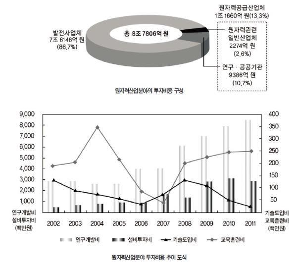 ¿øÀڷ°ø±Þ»ê¾÷üÀÇ °æ¿ì ÃÑ ÅõÀÚºñ¿ë Áß ¿øÀڷ¿¬±¸ºÐ¾ß 3720¾ï(31.9%), ¿øÀü°Ç¼³·¿î¿µºÐ¾ß 3189¾ï ¿ø(27.4%), ¿øÀÚ·ÂÁö¿ø·°ü¸®ºÐ¾ß 2661¾ï ¿ø(22.8%), ¿øÀڷ¾ÈÀüºÐ¾ß 1924¾ï ¿ø(16.5%),NDT ¹× ±âŸ ºÐ¾ß 158¾ï ¿ø(1.4%) ¼øÀ¸·Î ±¸¼ºµÇ¾î ÀÖ´Ù.