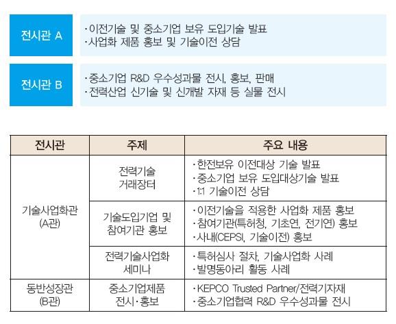 Àü·Â±â¼ú °Å·¡ÀåÅÍ + µ¿¹Ý¼ºÀå ¹Ú¶÷ȸ → ½Ã³ÊÁö È¿°ú UPÀ̹ø ¹Ú¶÷ȸ´Â Å©°Ô ‘±â¼ú»ç¾÷Ȱü(A°ü)’°ú ‘µ¿¹Ý¼ºÀå°ü(B°ü)’ÀÇ 2°³ÀÇ Àü½Ã°üÀ¸·Î ±¸ºÐµÇ¾î ¿î¿µµÇ¾úÀ¸¸ç, Çà»ç ±Ô¸ð´Â ÇÑÀü, À¯°ü±â°ü ¹× Áß¼Ò±â¾÷ µî ÃÑ 97°³ÀÇ ºÎ½º°¡ ¸¶·ÃµÇ¾ú´Ù. '±â¼ú»ç¾÷Ȱü'¿¡¼´Â ÇÑÀü, Áß¼Ò±â¾÷, ƯÇãû, ¿¬±¸±â°üÀÌ °¢°¢ °³¹ßÇÑ ¿ì¼ö Àü·Â±â¼úÀ» ¼Ò°³Çϰí, ¿ì¼ö±â¼úÀ» »ç¾÷ÈÇÑ Áß¼Ò±â¾÷ÀÇ Á¦Ç°¿¡ ´ëÇÑ ÆÇ·Î¸¦ ¿¾îÁÖ°íÀÚ 30°³ÀÇ È«º¸ºÎ½º ¿î¿µ ¹× ±â¼úÀÌÀü »ó´ã µîÀ» ÁøÇàÇÏ¿´À¸¸ç, À̿ܿ¡µµ ¿À´Â 10¿ù Á¦ÁÖµµ¿¡¼ ¿¸®´Â CEPSI 2014(Conference of Electric Power Supply Industry, Á¦20Â÷ µ¿¾Æ½Ã¾Æ ¼ÅÂÆò¾ç Àü·Â»ê¾÷ ÄÁÆÛ·±½º)¿Í ÇÑÀü º»»ç ÀÌÀü ¿¹Á¤Áö¿ªÀÎ ³ªÁÖÁö¿ªÀ» Áß½ÉÀ¸·Î Á¶¼ºÇÏ°Ô µÉ '¿¡³ÊÁö ¹ë¸®'¸¦ È«º¸ÇÏ´Â ºÎ½ºµµ µ¿½Ã¿¡ ¿î¿µÇÏ¿´´Ù. ¶ÇÇÑ ‘µ¿¹Ý¼ºÀå°ü’¿¡¼´Â ÇÑÀüÀÇ ¼öÃâÃËÁøº¸ÁõÁ¦µµ(KEPCO Trusted Partner) ÀÎÁõ±â¾÷À» Æ÷ÇÔÇÏ¿© ¿ì¼ö Áß¼Ò±â¾÷ÀÇ ½Å°³¹ß Àü·Â±âÀÚÀç, Çù·ÂR&D ¿ì¼ö ¼º°ú¹°, Àü·Â»ê¾÷ ½Å±â¼ú Á¦Ç° µîÀ» È«º¸ÇÒ ¼ö ÀÖ´Â 67°³ÀÇ ºÎ½º¸¦ ¿î¿µÇØ Çà»ç¿¡ Âü¿©ÇÑ ±¹³»¿Ü °ü°èÀڵ鿡°Ô ´Ù¾çÇÑ Àü·Â ½Å±â¼úÀ» ¾Ë¸®´Â ÀÚ¸®¸¦ ¸¶·ÃÇÏ¿´´Ù.