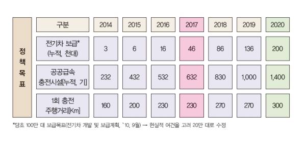 Çٽɱâ¼ú°³¹ß ±×µ¿¾È Áö¼ÓÀûÀÎ ¼º´É °³¼±¿¡µµ ºÒ±¸Çϰí, 1ȸ ÃæÀü ÁÖÇà°Å¸®(150kmÀ̳», È÷ÅÍ °¡µ¿½Ã 120kmÀ̳»)´Â ³»¿¬±â°ü (°¡¼Ö¸° 620km) ´ëºñ 25% ¼öÁØÀ̳ª, ÇâÈÄ 5´ë Çٽɱâ¼ú(°íÈ¿À² ¸ðÅͱâ¼ú, ¹èÅ͸® ¿ÂµµÁ¦¾î, ¹«±ÝÇü Â÷ü¼ºÇü, °íÈ¿À² °øÁ¶Á¦¾î, °íÀü¾Ð ÀüÀåÁ¦¾î)¿¡ 222¾ï ¿øÀ» ÅõÀÚÇØ 2020³â±îÁö 1ȸ ÃæÀü ÁÖÇà°Å¸®¸¦ 300km·Î È®´ëÇØ ³ª°£´Ù. °³¹ß°úÁ¤ Áß ¹èÅ͸® °³¹ßÀº ¹Î°£ Àü¹®¾÷ü Àü¼Ó¿µ¿ªÀ¸·Î ÁÖ·Î ¹èÅ͸® ÀÌ¿ÜÀÇ ¸ðÅÍ, °øÁ¶ µî ÇÙ½É ºÎǰ À§ÁÖ·Î Áö¿øÀÌ ÀÌ·ïÁú °èȹÀÌ´Ù. Â÷·®º¸±Þ È®´ë ±¸¸ÅÀÚÀÇ ºÎ´ã¿ÏÈ¿Í Ãʱâ½ÃÀå Çü¼ºÀ» À§ÇØ ½Â¿ëÂ÷ÀÇ °æ¿ì ¸Å³â º¸Á¶±Ý Áö¿ø´ë»óÀ» È®´ë(2015³â 3000´ë, 2016³â 1¸¸ ´ë, 2017³â 3¸¸ ´ë, 2018³â 4¸¸ ´ë, 2019³â 5¸¸ ´ë, 2020³â 6¸¸4000´ë)ÇØ ³ª°¡°í Àü±â¹ö½º´Â 2020³â±îÁö ÇöÇà Áö¿ø±ÝÀÎ ´ë´ç 1¾ï ¿øÀ» À¯ÁöÇÏ°Ô µÈ´Ù. ¶ÇÇÑ ¹èÅ͸® º¸Áõ±â°£ ÀÌÈÄ, ¹èÅ͸® ±³Ã¼½Ã ±³Ã¼ºñ¿ëÀÇ 30% ¼öÁØ¿¡¼ Áö¿øÇÏ´Â ¹æ¾Èµµ °í·ÁµÇ°í ÀÖ´Ù. º¸±Þ Â÷·®ÀÇ °æ¿ì ±âÁ¸ÀÇ ½Â¿ëÂ÷ À§ÁÖ¿¡¼ Àü±âȹ°Â÷, Àü±âÅýÃ, Àü±â¹ö½º, ÁÖÇà°Å¸®È®Àå Àü±âÂ÷ µî º¸±ÞÂ÷·®µµ ´Ùº¯È ÇÒ °èȹÀÌ´Ù. À̸¦ À§ÇØ ³»³âºÎÅÍ °ø°ø±â°ü¿¡¼ ±¸ÀÔÇÏ´Â ½Â¿ëÂ÷ Áß 25%¸¦ Àü±âÂ÷·Î ±¸¸ÅÇϵµ·Ï Àǹ«ÈÇÏ°í °³º°¼Òºñ¼¼ µî ÃÖ´ë 420¸¸ ¿øÀÇ ¼¼Á¦Áö¿øµµ 2017³â±îÁö ¿¬ÀåµÈ´Ù.