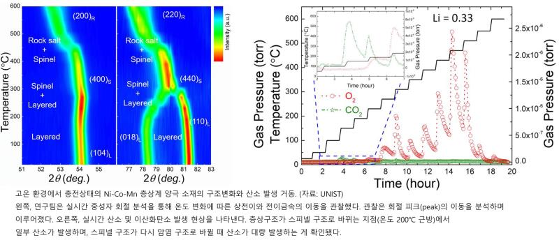 ![]() ÈÀç·ÎºÎÅÍ ¾ÈÀüÇÑ ¹èÅ͸®¸¦ ¸¸µå´Â ±â¼ú ÁÖ¿øÀÎÀÎ »ê¼Ò ¹ß»ýÇö»ó ±Ô¸í, ¼ö°è ÀüÇØÁú ¹èÅ͸® ±â¼úµµ ¸®Æ¬À̿ ¹èÅ͸®´Â ±¤¹üÀ§ÇÏ°Ô »ç¿ëµÇ°í ÀÖÁö¸¸, ÀüÇØÁú¿¡ °¡¿¬¼º À¯±â¿ë¸Å¸¦ »ç¿ëÇϱ⠶§¹®¿¡ ¹ßÈ¿Í ÈÀçÀÇ À§Ç輺ÀÌ ÀáÀçµÅ ÀÖ´Ù. ½ÇÁ¦ 2017³âºÎÅÍ 2019³â±îÁö ±¹³»¿¡¼´Â ¸®Æ¬À̿ ¹èÅ͸®·Î ÀÎÇØ 33°ÇÀÇ ESS ÈÀç°¡ ¹ß»ýÇß°í, °¡µ¿ÀÌ Áß´ÜµÈ °÷ÀÌ Àüü Áß 35%¿¡ ´ÞÇØ Å« ¼ÕÇØ°¡ ¹ß»ýÇÑ ¹Ù ÀÖ´Ù. ÀÌ¿¡ ¹ßÈ¿Í ÈÀç À§ÇèÀÌ ¾ø´Â ¹èÅ͸®¸¦ ¸¸µé±â À§ÇÑ ³ë·ÂÀÌ È°¹ßÇÑ °¡¿îµ¥, ±¹³» ¿¬±¸ÁøÀÌ ¹èÅ͸® ¹ßÈÀÇ ÁÖ¿ä ¿øÀÎÀÎ »ê¼Ò ¹ß»ý µîÀÇ ¿øÀÎÀ» ±Ô¸íÇÏ°í ¾ç±ØÀç ¼³°èÀÇ ±âÁØÀÌ µÉ ¸¸ÇÑ ¿¬±¸¸¦ ¹ßÇ¥ÇØ °ü½ÉÀ» ¸ðÀ¸°í ÀÖ´Ù. À̿ܿ¡µµ ÈÀ縦 ¿øÃµÀûÀ¸·Î Â÷´ÜÇÒ ¼ö ÀÖ´Â ¼ö°è ÀüÇØÁú ¹èÅ͸®¿¡ °üÇÑ ¿¬±¸µµ À̾îÁö°í ÀÖ´Ù. (¸ÞÀÎ À̹ÌÁö: °í¿Â ȯ°æ¿¡¼ ÃæÀü»óÅÂÀÇ Ni-Co-Mn Ãþ»ó°è ¾ç±Ø ¼ÒÀçÀÇ ±¸Á¶º¯È¿Í »ê¼Ò ¹ß»ý °Åµ¿. ÀÚ·á: UNIST) Á¤¸® °Ã¢´ë ±âÀÚ ÀÚ·á ¿ï»ê°úÇбâ¼ú¿ø(UNIST), ±¤ÁÖ°úÇбâ¼ú¿ø(GIST), ±âÃʰúÇבּ¸¿ø(IBS) ¹èÅ͸® ÈÀç ¹× Æø¹ß·Î ÀÎÇØ ¾ÈÀüÇÑ ¹èÅ͸® °³¹ßÀÇ Á߿伺ÀÌ ´ëµÎµÇ°í ÀÖ´Ù. ƯÈ÷, ¹èÅ͸®ÀÇ ¾ÈÁ¤¼ºÀº ÃæÀü»óÅ¿¡¼ ¾ç±Ø ¼ÒÀçÀÇ »ê¼Ò ¹ß»ý°ú Á÷Á¢ÀûÀÎ °ü·ÃÀÌ ÀÖ´Â °ÍÀ¸·Î ¾Ë·ÁÁ® ÀÖ´Ù. µû¶ó¼ °í¿Â ȯ°æ¿¡¼ ¾ç±Ø ¼ÒÀçÀÇ »ê¼Ò ¹ß»ý°ú ÀÌ¿¡ µ¿¹ÝµÇ´Â ±¸Á¶º¯È¸¦ ÀÌÇØÇÏ´Â °ÍÀº ¾ÈÀüÇÑ ¹èÅ͸® °³¹ß¿¡ ¾Õ¼ ¹Ýµå½Ã ÇÊ¿äÇÏ´Ù. ÀÌ¿¡ ¾ç±Ø ¼ÒÀçÀÇ »ê¼Ò ¹ß»ý°ú ±¸Á¶º¯È Çö»ó¿¡ °üÇÑ ¿¬±¸°¡ Ȱ¹ßÇÏ°Ô ÀÌ·ç¾îÁ³´Ù. ±×·¯³ª ±¸Á¶º¯È¿Í »ê¼Ò ¹ß»ý °Åµ¿ÀÌ ¼·Î ¾î¶°ÇÑ ¿µÇâÀ» ÁÖ´ÂÁö »ó°ü°ü°è°¡ ºÐ¸íÇÏÁö ¾Ê¾Ò´Ù. ¶ÇÇÑ, ÀüÀ̱ݼӸ¶´Ù ±× »ó°ü°ü°è°¡ ¾î¶»°Ô ³ªÅ¸³ª°í ¾î¶°ÇÑ ¿µÇâÀ» ¹ÌÄ¡´ÂÁö ÆÄ¾ÇµÇÁö ¸øÇÑ ½ÇÁ¤À̾ú´Ù. ÀÌ¿¡ ¿ï»ê°úÇбâ¼ú¿ø(UNIST) ¿¡³ÊÁöÈÇаøÇаú Á¤¼º±Õ ±³¼ö´Â ¹èÅ͸® °í¿Â ÀÛµ¿È¯°æ¿¡¼ ¾ç±Ø ¼ÒÀç ¹Ì¼¼ ±¸Á¶ º¯È¿Í »ê¼Ò ¹ß»ý °£ÀÇ »ó°ü°ü°è¸¦ ±Ô¸íÇÏ´Â ¿¬±¸¸¦ ÁøÇàÇß´Ù. ƯÈ÷, ÀÌ °úÁ¤¿¡¼ ¾ç±Ø ¼ÒÀç ¼ººÐº° »ê¼Ò ¹ß»ý Çö»óÀ» ºÐ¼®ÇØ ÇâÈÄ »õ·Î¿î ¾ç±Ø ¼ÒÀç ¼³°è¿¡ ±â¿©ÇÒ °ÍÀ¸·Î ±â´ë¸¦ ¸ðÀ¸°í ÀÖ´Ù. À̹ø ¿¬±¸¿¡´Â Çѱ¹¿øÀڷ¿¬±¸¿ø ±èÇü¼· ¹Ú»ç¿Í ¼¿ï´ë Àç·á°øÇкΠ°±â¼® ±³¼öÆÀ°ú ÇÔ²²Çß´Ù.1) ![]() ¾Ï¿° ±¸Á¶·ÎÀÇ »óÀüÀ̸¦ ´ÊÃß´Â ÄÚ¹ßÆ® °í¿ÂÀÇ ÀÛµ¿È¯°æ¿¡¼ ¹èÅ͸® ¾ç±Ø¿¡¼ ³ª¿À´Â »ê¼Ò¿Í À¯±â°è ¹èÅ͸® ÀüÇØÁúÀÌ ¸¸³¯ °æ¿ì ¿¬¼Ò ¹ÝÀÀÀÌ ÀϾ ¼ö ÀÖ´Ù. µû¶ó¼ ¾ÈÀüÇÑ ¹èÅ͸® °³¹ßÀ» À§Çؼ´Â ³»ºÎ¿¡¼ »ê¼Ò°¡ ¾î¶»°Ô ¹ß»ýÇÏ´ÂÁö ¶Ç ¾ó¸¶³ª ¹ß»ýÇÏ´ÂÁö¸¦ ¾Ë¾Æ³»´Â °ÍÀÌ Áß¿äÇÏ´Ù. ¿¬±¸ÆÀÀº »ê¼Ò°¡ ¹ß»ýÇÏ´Â Çö»ó°ú ¾ç±Ø ¼ÒÀçÀÇ ¹Ì¼¼±¸Á¶°¡ º¯ÇÏ´Â °ÍÀÇ »ó°ü°ü°è¸¦ ºÐ¼®Çß´Ù. ±×¸®°í ¾ç±Ø ¼ÒÀç ³»¿¡ ÄÚ¹ßÆ® ¼ººÐ ÇÔ·®À» ³ô¿© »ê¼Ò ¹ß»ýÀ» ÁÙÀÌ´Â »õ·Î¿î ¼³°è ¿ø¸®¸¦ Á¦½ÃÇß´Ù. ÄÚ¹ßÆ®°¡ ¸¹À»¼ö·Ï »ê¼Ò ¹ß»ýÀÇ ÁÖ¿ä ¿øÀÎÀÌ µÇ´Â ¾Ï¿° ±¸Á¶·ÎÀÇ »óÀüÀ̸¦ ´ÊÃâ ¼ö Àֱ⠶§¹®ÀÌ´Ù. »óÀüÀÌ´Â ¼ÒÀç ³» ¿øÀÚ(¿ø¼Ò)µéÀÇ ¹è¿ ¸ð¾ç°ú À§Ä¡°¡ ¹Ù²î´Â Çö»óÀ¸·Î, ¾ç±Ø ¼ÒÀç°¡ °í¿Â¿¡ ³ëÃâµÇ¸é »óÀüÀ̰¡ ÀϾÙ. ¹«¾ùº¸´Ù À̹ø ¿¬±¸¿¡¼ ¾ç±Ø ¼ÒÀçÀÇ ¼ººÐÀ» ±¸ºÐÇÒ ¼ö ÀÖ´Â Áß¼ºÀÚȸÀý ±â¹ýÀÌ Å« ¿ªÇÒÀ» Çß´Ù°í ÇÑ´Ù. ±âÁ¸¿¡ ¹èÅ͸® Àü±Ø ³»ºÎ Áø´Ü¿¡ »ç¿ëÇÏ´ø ¿¢½º¼± ȸÀý ºÐ¼® ¹æ¹ýÀ¸·Î´Â ±¸Á¶º¯È¿¡ ´ëÇÑ ÀüÀ̱ݼÓÀÇ ¿ªÇÒÀ» ±¸ºÐÇϱ⠾î·Á¿ü´Ù. ÀÌ ºÐ¼® ¹æ½ÄÀº X-¼±ÀÌ °¢ ±Ý¼Ó ¿øÀÚÀÇ ÀüÀÚ¿Í »óÈ£ ÀÛ¿ëÇÏ¸ç ³ªÅ¸³ª´Â ÆÐÅÏÀ» ºÐ¼®ÇØ ³»ºÎ ±¸Á¶¸¦ Áø´ÜÇÏ´Â ¹æ½ÄÀε¥, ´ÏÄÌ(Ni), ÄÚ¹ßÆ®(Co), ¸Á°£(Mn)Àº ¼·Î ¿øÀÚ¹øÈ£°¡ °¡±õ°í ÀüÀڹеµ°¡ ºñ½ÁÇϱ⠶§¹®ÀÌ´Ù. ¹Ý¸é Áß¼ºÀÚȸÀý ºÐ¼®Àº Áß¼ºÀÚ »ê¶õ ±æÀ̰¡ ¿ø¼Ò¸¶´Ù ¼·Î ´Þ¶ó ¹èÅ͸®¸¦ ±¸¼ºÇÏ´Â ÀüÀ̱ݼÓÀ» ½±°Ô ±¸ºÐÇÒ ¼ö ÀÖ´Â ÀåÁ¡ÀÌ ÀÖ´Ù. Çѱ¹¿øÀڷ¿¬±¸¿ø ±èÇü¼· ¹Ú»ç´Â Áß¼ºÀÚȸÀý ºÐ¼®ÀÌ “°áÁ¤ ±¸Á¶ ³» ¸®Æ¬·®À» Á¤È®È÷ ÃøÁ¤ÇÒ ¼ö ÀÖ´Â À¯ÀÏÇÑ ºÐ¼®¹ý”À̶ó¸ç “¾ÕÀ¸·Î ¹èÅ͸® ºÐ¼® ºÐ¾ß¿¡ ¸¹ÀÌ È°¿ëµÉ °Í”À̶ó°í Àü¸ÁÇß´Ù. ¿¬±¸ÁøÀº ¹èÅ͸® ¿Âµµ¸¦ ³ô¿©°¡¸é¼ ³»ºÎ ¿øÀÚ ¹è¿ ±¸Á¶º¯È¿Í »ê¼Ò ¹ß»ý Çö»óÀ» ½Ç½Ã°£À¸·Î ºÐ¼®Çß´Ù. Áß¼ºÀÚȸÀý ºÐ¼® ±â¹ý°ú ´õºÒ¾î Á¤È®ÇÑ »ê¼Ò ¹ß»ý·® ºÐ¼®À» À§Çؼ ±âü Áú·® ºÐ¼®¹ýÀ» ½è´Ù. ½ÇÇè °á°ú, ¾ç±Ø ¼ÒÀç ³»ÀÇ ÄÚ¹ßÆ®°¡ ÀüÀ̱ݼÓÃþ¿¡¼ ¸®Æ¬ÃþÀ¸·Î À̵¿Ç