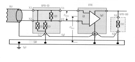 2. SPDÀÇ ¼±Á¤<±×¸² 2>¿¡ ³ú¹æÈ£±¸¼º¿¹¿Í ¹æÈ£¿µ¿ªÀ» ³ªÅ¸³½´Ù. ITÀåÄ¡(ITE)¸¦ º¸È£Çϱâ À§ÇØ ³úº¸È£¿µ¿ª(LPZ)À» LPZ 0A, LPZ 0B, LPZ 1, LPZ 2, LPZ 3À¸·Î ±¸ºÐÇϰí, LPZ 1 ~ LPZ 3 °¢°¢ÀÇ °æ°è¿¡ SPD¸¦ ¼³Ä¡Çϰí, ´Ü°èÀûÀ¸·Î °úÀü¾Ð¡¤°úÀü·ù ·¹º§À» Àú°¨½ÃŲ´Ù. º¸È£¿µ¿ªÀÇ °³³äÀº °Ç¹°ÀÇ ÀÔ°í¿¡ ³õÀº Á¦ÀÏÀÇ SPD(j, m)´Â ÁÖ·Î ³ú¼ÁöÀÇ Å« ¿¡³ÊÁö 󸮸¦ ´ã´çÇϰí, Åë½Å¼³ºñ³»ºÎÀÇ ´ëÀü·ù ¼ÁöÀü·ùÀÇ Ä§ÀÔÀ» ¸·´Â´Ù. ÀÌ SPD¿¡ ÀÇÇÑ ÀÌÇÏÀÇ ÇÏ·ù¿¡ ÀÖ´Â SPD·Î ¼Áö ¿¡³ÊÁö°¡ Àú°¨ÇÒ ¼ö ÀÖ´Ù. ´ÙÀ½ ´Ü°èÀÇ SPD(k, 1 ¶Ç´Â n, o)´Â ¼Áö·¹º§À» ÀÌÇÏÀÇ ÇÏ·ùÀÇ ¹æÈ£ ¶Ç´Â ÀåÄ¡°¡ Çã¿ëÇÒ ¼ö ÀÖ´Â °ªÀ¸·Î ´õ¿í Àú°¨ÇÑ´Ù.SPDÀÇ ³»·®Àº º¸È£¿µ¿ªÀÇ ´Ü°è ¹× <Ç¥ 1>¿¡ ±âÀçÇÑ Àü¾Ð¹æÈ£ ·¹º§¿¡ µû¶ó ¼±Á¤ÇÑ´Ù. SPDÀÇ Àü¾Ð¹æÈ£ ·¹º§ UP°¡ ´ÙÀ½ÀÇ SPD ¶Ç´Â ITÀåÄ¡·Î ±ÔÁ¤ÇØ¾ß ÇÒ Àü¾Ð°ª º¸´Ù ³·¾Æ Áöµµ·Ï ¼±Á¤ÇÑ´Ù. <Ç¥ 1>¿¡¼ ³úº¸È£¿µ¿ªÀÇ ¼±Á¤Àº °æ°è LPZ 0/1ÀÇ Àü³úÀü·ù IBÀÇ ºÎºÐ(ºÎºÐ³úÀü·ùIPC)°¡ SPD(j)°æÀ¯·Î IT½Ã½ºÅÛÀ¸·Î ÀúÇ×°áÇÕÇÏ´Â °ÍÀ» ÀüÁ¦·ÎÇÑ´Ù. IT½Ã½ºÅÛ³»¿¡ Àü¹ÝÇÏ´Â ÃÖÁ¾ÀûÀÎ ³úÀü·ùÆÄÇüÀº ½Ã½ºÅÛÀÇ ¹è¼± ¹× SPDÀÇ µ¿ÀÛ¿¡ ÀÇÇØ º¯ÈÇÑ´Ù. SPD(j)ÀÇ ¹æÈ£·¹º§ÀÌ ±â±âÀÇ ³»·Â·¹º§ º¸´Ù ³ôÀº °æ¿ì´Â SPD(j)¿Í Çù·ÂÇÏ¿© ÀûÀýÇÑ ¹æÈ£·¹º§À» °¡Áø SPD¸¦ ¼³Ä¡ÇÑ´Ù. ´ëü¾ÈÀ¸·Î ÀûÀýÇÑ Àü¾Ð¹æÈ£ ·¹º§À» °¡Áø SPD¸¦ SPD(j)·Î ¹Ù²ã ³õ´Â´Ù. ³ú°ÝÀÇ ÀüÀÚÈ¿°ú ¶Ç´Â ¹Ì¸® ¼³Ä¡Çϰí ÀÖ´Â SPDÀÇ °úµµÀûº¯È¿¡ µû¶ó À¯±âÇÒ ¼ÁöÀü·ù´Â 8/20§ÁÀÇ Àü·ùÆÄÇüÀÌ´Ù. IT³×Æ®¿öÅ© ¹× Åë½Åȸ¼±¿¡ ±ÙÁ¢Çϰí, ±× ȸ¼±¿¡ Á¢¼ÓÇϰí ÀÖ´Â IT ÀåÄ¡¿¡¼ ¶³¾îÁ®ÀÖ´Â ³ú°Ý¿¡ ÀÇÇØ À¯±âÇÏ´Â Àü¾ÐÀº 10/700§ÁÀÇ Àü¾ÐÆÄÇüÀÌ´Ù.Åë½Åȸ¼±ÀÌ ¼ÛÀü¼±ÀÇ Áö¶ô»ç°í¿¡¼ °úÀü¾ÐÀ» ¹ÞÀº °æ¿ì¸¦ »óÁ¤ÇÏ°í ±¹¼ÒÀÇ ´ëÁö°£Àü¾ÐÀº SPD¸¦ Åë½Åȸ¼±°ú Á¢Áö´ÜÀÚ¿ÍÀÇ »çÀÌ¿¡ Á¢¼ÓÇÏ¿© Á¦ÇÑÇÑ´Ù. ´Ü¸»±â±âÀÇ Àý¿¬³»·ÂÀº ¹æÈ£ µð¹ÙÀ̽ºÀÇ ¹æÀü°³½ÃÀü¾Ð ¹× ´ëÁö±îÁöÀÇ ¹è¼± ÀÎÇÇ´ø½º¸¦ °í·ÁÇØ ³Ö¾î ¼±Á¤Çϰí, ±× ¼Ò¿ä¼º´ÉÀº ITU-T±Ç°í K20, K21 ¹× K45 µî¿¡ ±âÃÊÇÑ Á¦Ç°±º ¶Ç´Â Á¦Ç°¿¡¼ ¼±Á¤ÇÑ´Ù.3. °ÇÃ๰ ³»ºÎÀÇ IT½Ã½ºÅÛ¿¡ ´ëÇÑ ³úÀ¯µµ°úÀü¾ÐÀÇ ¿µÇâ³úÀ¯µµ°úÀü¾ÐÀº °ÇÃ๰³»¿¡ ³ªÅ¸³ª°í, Àü¼úÇÑ ¸ÞÄ¿´ÏÁò¿¡ ÀÇÇØ ³»ºÎ ³×Æ®¿öÅ©¿Í °áÇÕÇÑ´Ù. ÀÌ °úÀü¾ÐÀº ÀϹÝÀûÀ¸·Î ´ëÁö°£ÀÌÁö¸¸, ¼±°£¿¡ ³ªÅ¸³ª´Â °æ¿ì°¡ ÀÖ´Ù. Á¤º¸Åë½ÅÀåÄ¡³»ÀÇ ºÎǰ ÆÄ¼Õ, Àý¿¬ÆÄ±«´Â ÀÌ °úÀü¾Ð¿¡ ÀÇÇØ »ý±ä´Ù. ÀÌ ¿µÇâÀ» Á¦ÇÑÇϱâ À§ÇÑ SPD´Â <±×¸² 3>¿¡ µû¶ó ¼³Ä¡ÇÑ´Ù. °°Àº ±×¸²¿¡¼ (c) : SPD³»ÀÇ ÀüºÎ ´ëÁö°£Àü¾ÐÁ¦ÇÑ ¼Áö Àü¾Ð¼ÒÀÚ¸¦ Á¢¼ÓÇÏ´Â SPDÀÇ °øÅëÁ¢¼ÓºÎ, (d) : µîÀüÀ§º»µù¿ë ¹Ù, (f) : Á¤º¸±â¼ú ¶Ç´Â Åë½ÅÆ÷Æ® (g) : Àü¿øÆ÷Æ® (h) : Á¤º¸±â¼ú ¶Ç´Â Åë½Åȸ¼± ȤÀº ³×Æ®¿öÅ© (i) : JIS C 5381 - 21ÀÇ <Ç¥ 3>¿¡ µû¸¥ SPD, (o) : JIS C 5381 -1 ÀÇ Å¬·¡½º¥²½ÃÇè¿¡ µû¸¥ Àü¿ø¿ë SPD, (p) : Á¢ÁöµµÃ¼ (q) : ÇÊ¿äÃÖ¼ÒÇÑÀÇ Á¢¼Ó UP(C) : Àü¾Ð¹æÈ£·¹º§·Î Á¦ÇÑÇÑ ´ëÁö°£Àü¾Ð, UP(D) : Àü¾Ð¹æÈ£·¹º§·Î Á¦ÇÑÇÑ ¼±°£Àü¾Ð, X1,X2 : SPD¸¦ Á¢¼ÓÇÏ´Â ¹«ÀåÈ£ÃøÀÇ ´ÜÀÚ·Î, ±× ´Ü°¡°£¿¡ Á¦ÇѼÒÀÚ (1,2)¸¦ ¼³Ä¡ÇÏ´Â Y1,Y2 : ¹æÈ£ÃøÀÇ SPDÁ¢¼Ó´ÜÀÚ, (1) : Ä¿¸Õ¸ðµåÀü¾ÐÀ» Á¦ÇÑÇÏ´Â ¼ÁöÀü¾Ð¹æÈ£¼ÒÀÚ, (2) : ¼±°£Àü¾ÐÀ» Á¦ÇÑÇÏ´Â ¼ÁöÀü¾Ð¹æÈ£¼ÒÀÚÀÌ´Ù.Á¤º¸Åë½Å½Ã¼³ÀÇ Á¢ÁöÁ¤º¸Åë½Å½Ã¼³ÀÇ Æ¯Â¡Àº ¿ÜºÎ¿¡¼ ±× Áö¿ªÀÇ Á¾È¾¹«ÁøÀ¸·Î »± µÑ·¯ÃÄÁø ´Ù¼öÀÇ Åë½Å¼±À» Àâ¾Æ²ô´Â °Í ¹×, °Ç¹°³»ºÎ¿¡µµ ´Ù¸¥ Åë½Å¼³ºñ°£À» ¿«´Â ½ÅÈ£¼±ÀÌ µ¿ÀÏÇ÷ξî´Â ¹°·Ð Ç÷ξµµ ´Ù¼ö Á¢¼ÓµÇ´Â °ÍÀÌ´Ù. ¶Ç, ¿Á»ó¿¡ ¼ö³úºÎ¿Í ¹«¼± ¾ÈÅ׳ª¿ëÀÇ Ã¶Å¾ÀÌ ¼³Ä¡µÈ °æ¿ì°¡ ¸¹±â ¶§¹®¿¡, ÇÇ·Úħ°ú öž¿¡ ³ú°ÝÀÌ ÀÖÀ¸¸é ±× ³úÀü·ù°¡ ºôµùÀÇ Ã¶°ñ, ö±Ù, µéº¸¸¦ ³¢¿ì°í È帣±â ¶§¹®¿¡ ÀåÄ¡ÀÇ Ç÷¹ÀÓÀÌ ±×¿¡ Á¢¼ÓµÇ¾îÀÖÀ¸¸é Åë½ÅÀåÄ¡¿¡ ¿µÇâÀ» ¹ÌÄ¡´Â °ÍÀÌ´Ù. À̰°Àº ¹®Á¦¸¦ ÇØ°áÇϱâ À§Çؼ´Â Á¤º¸Åë½Å½Ã¼³ÀüüÀÇ Á¢Áö±¸¼º, ÀåÄ¡·¹º§ÀÇ Á¢Áö±¸¼º¿¡ µû¸¥ ´ëÃ¥À» ÇàÇÏ´Â °ÍÀÌ ÇÊ¿äÇÏ´Ù.Á¤º¸Åë½Å½Ã¼³Àüü¿¡¼ Á¢Áö±¸¼ºÀ¸·Î »ê»ó¹«¼±ÁߴܼҷΠ´ëÇ¥µÇ´Â ¾ÈÅ׳ªÃ¶Å¾ µî¿¡ Á÷°Ý³ú¸¦ ¹Þ±â½¬¿î ½Ã¼³·Î´Â <±×¸² 4>¿¡ ³ªÅ¸³ª´Â ȯ»ó¿¬Á¢Á¢ÁöÀÇ Ã¤¿ëÀÌ ¹Ù¶÷Á÷ÇÏ´Ù. ƯÈ÷ »ê»óÀº ÁÖº¯¿¡ ¹ÙÀ§°¡ ¸¹±â ¶§¹®¿¡, °³°³ÀÇ Á¢Áö ÀÎÇÇ´ø½º¸¦ ÀÛ°ÔÇÏ´Â °ÍÀÌ ¾î·Æ´Ù. ±×·¡¼ °Ç¹°³»ºÎÀÇ È¯»óÁ
