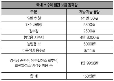 ¿ì¸®³ª¶ó ÃÖÃÊ ¼Ò¼ö·ÂÀº 1978³â ÁذøÇÑ °¿øµµ Ⱦ¼º±º ¾ÈÈï¸é ¼Ò¼ö·Â¹ßÀü¼Ò(450§Ò)´Ù. ±× ÈÄ ¼Ò¼ö·ÂÀº °æÁ¦¼ºÀÌ ºÎÁ·ÇØ °³¹ßÀÌ ¹ÌÁøÇÏ´Ù, ÃÖ±Ù ¼öÂ÷¹ßÀü±âÀÇ ±¹»êÈ¿Í Á¤ºÎÀÇ º¸±Þ È®´ë Á¤Ã¥ µîÀ¸·Î °ø°ø ±â°ü¿¡¼ ¹Î¿ø ¹ß»ý ¿ì·Á°¡ ´úÇÑ ±âÁ¸ ½Ã¼³¹°À» ÀÌ¿ëÇÑ ¼Ò¼ö·ÂÀ» Ȱ¹ßÇÏ°Ô °³¹ßÇÏ¸ç °æÁ¦Àû Ÿ´ç¼ºÀ» ÀÔÁõÇϰí ÀÖ´Ù. 2010³â 10¿ù ±âÁØ ¼Ò¼ö·Â °³¹ß ÇöȲÀº °³ÀÎ »ç¾÷ÀÚ 19°³¼Ò, Çѱ¹¼öÀÚ¿ø°ø»ç 19°³¼Ò, ÇÑÀü ¹ßÀü ÀÚȸ»ç 13°³¼Ò, ÁöÀÚü 7°³¼Ò(Çϼö Á¾¸» ó¸®Àå 6°³¼Ò, Á¤¼öÀå 1°³¼Ò), Çѱ¹³ó¾îÃ̰ø»ç 10°³¼Ò µî ÃÑ 63°³¼Ò¿¡ 9¸¸ 367§Ò ¼³ºñ ¿ë·®À» °³¹ßÇßÀ¸¸ç, ¿¬°£ Àü±â »ý»ê·®Àº 15¸¸ 7279§Óh¿¡ ´ÞÇÑ´Ù. ¿ÃÇØ RPS Á¦µµ ½ÃÇà°ú Áö¿ª ¿¡³ÊÁö º¸±Þ »ç¾÷ µî ½ÅÀç»ý¿¡³ÊÁö º¸±Þ Á¤Ã¥¿¡ µû¶ó ¹ßÀü »ç¾÷ÀÚ´Â ½ÅÀç»ý¿¡³ÊÁö ¹ßÀü¿ø¿¡ ´ëÇÑ ÅõÀÚ°¡ ºÒ°¡ÇÇÇØÁ³´Ù. ÀÌ¿¡ µû¶ó Ãʱâ ÅõÀÚºñ¿Í CO2 ¹èÃâÀÌ ³·Àº ¼Ò¼ö·Â ½ÃÀåÀÌ ±ÞÁõÇÒ °ÍÀÌ´Ù. ÇÑÆí, Á¤ºÎ´Â 'Á¦3Â÷ ½ÅÀç»ý ¿¡³ÊÁö ±â¼ú °³¹ß ¹× ÀÌ¿ë º¸±Þ ±âº» °èȹ'À» ÅëÇØ "½ÅÀç»ý¿¡³ÊÁö º¸±Þ ¸ñÇ¥¸¦ 2015³â 4.3%, 2020³â 6.1%, 2030³â 11%·Î Á¤Çϰí, ÁÖ¿ä º¸±Þ Á¤Ã¥À¸·Î ±×¸° Ȩ 100¸¸È£ »ç¾÷°ú ½ÅÀç»ý¿¡³ÊÁö ¿ì¼ö ¸¶À»(±×¸° ºô¸®Áö) 200°³ Á¶¼º µîÀ» ÃßÁøÇϰڴÙ"¶ó°í ¹àÇû´Ù. ƯÈ÷, ±×¸° ºô¸®ÁöÀÇ °æ¿ì ÁöÇü°ú ±âÈÄ µî ÀÚ¿¬ Á¶°Ç°ú Á¶È¸¦ ÀÌ·ç¸ç ºÎÁ¸ ÀáÀç·®ÀÌ ¸¹Àº ¼Ò¼ö·ÂÀÌ ÀÌ»óÀûÀÌ´Ù. Çϼö Á¾¸» ó¸®Àå, Á¤¼öÀå(»ó¼öµµ), ³ó¾÷¿ë Àú¼öÁö¿Í º¸, »ç¹æ ½Ã¼³, ȷ¹ßÀü¼Ò ³Ã°¢¼ö, À°»ó ¾ç½ÄÀå ¹èÃâ¼ö, ºôµù ³» ¼ö ¡¤ Ãà¿½Ä °øÁ¶ ¼³ºñ µî ¼Ò¼ö·Â ¹ßÀüÀº ¹°ÀÌ È帣´Â °÷ÀÌ¸é °¡´ÉÇÏ´Ù. ¶ÇÇÑ, ¼Ò¼ö·ÂÀº ž籤°ú dz·Â µîÀÇ Àç»ý¿¡³ÊÁö¿¡ ºñÇØ ºÎÇÏ ÃßÁ¾¼ºÀÌ ¶Ù¾î³ª¸ç, ±â»ó º¯È¿¡ ±¸¾Ö ¹ÞÁö ¾Ê°í ¾ÈÁ¤ÀûÀ¸·Î ¹ßÀüÇÒ ¼ö ÀÖ´Ù. ¿ì¸®³ª¶ó ¼Ò¼ö·ÂÀÇ Ç³ºÎÇÑ °³¹ß ÀáÀç·ÂÀº ¾à 1500§Ó·Î ¿¡³ÊÁö Àý°¨ ´ëÃ¥¿¡ ÀûÇÕÇÑ ÀÚ¿øÀÌ´Ù.