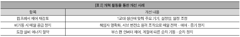 <Ç¥ 2>´Â °³¼± »ç·ÊÀÇ ÀÏ·Ê´Ù. ù° Ç׸ñÀº ÄÄÇÁ·¹¼ÀÇ Á¦¾î Àç°ËÅä »ç·Ê·Î, °øÀå ºÎÇÏ »óȲÀÌ ¹Ù²î±â¿¡ °¢Á¾ ¼³Á¤À» ´Ù¾çÇÑ ÆÐÅÏÀ¸·Î ½ÇÇèÇØ º¯°æÇß´Ù. ¼Â° Ç׸ñÀº µµÀåÓóíû¿¡¼ ¾²´Â ´ëÇü ÆÒÀ» ÀιöÅÍÈÇØ ªÀº ÈÞ½Ä ½Ã°£°ú °°ÀÌ Á¤Áö°¡ ¾î·Á¿î ¶§´Â ¡ãdz·®À» ³·Ãß´Â °³¼± ¡ã½Â¿Â ½Ã°£ ¡ã¿©¿æ®æðÈ¿°ú¸¦ Á¶»çÇØ ±âµ¿ Á¤Áö ½Ã°£À» Àç°ËÅäÇÑ »ç·Ê´Ù. ÀÌ·¯ÇÑ °³¼±À» ÅëÇØ °íÁ¤ºñ Àý°¨¿¡ Èû¾²°í ÀÖ´Ù.