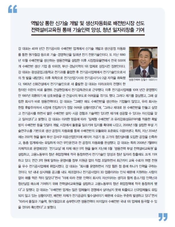 ºÎ»ê±¤¿ª½Ã °¼±¸ ¹ÌÀ½»ê´Ü¿¡ À§Ä¡ÇÑ ¼ö¹èÀü¹Ý Àü¹® Á¦Á¶±â¾÷, ½Ö¿ëÀü·ÂÀº Áö³ 2008³âºÎÅÍ ‘Àü±â±³½Ç’ À» ¼³¸³ÇÏ¿© ÇöÀç±îÁö °íµîÇлý°ú ÀϹÝÀÎ ¾à 2,000¿© ¸í¿¡°Ô ÇöÀå½Ç¹« Áß½ÉÀÇ ±â¼ú±³À°À» ½Ç½ÃÇØ ¿Ô´Ù. ½Ö¿ëÀü·ÂÀº ÃÖ±Ù 15¾ï ¿øÀ» ÅõÀÚÇÏ¿© ±âÁ¸¿¡ ¿î¿µÇÏ´ø Àü±â±³½ÇÀ» ºÎ¼³ ‘Àü·Â¼³ºñ±³À°¿ø’À¸·Î È®ÀåÇß´Ù. ±³À°¿ø È®Àå °³¿øÀÇ ¹è°æ¿¡´Â “±â¼úÀ» È®º¸ÇÏ´Â °Íµµ Áß¿äÇÏÁö¸¸ ÈÄÇеéÀ» À°¼ºÇÏ´Â °ÍÀÌ ÈξÀ ´õ º¸¶÷ ÀÖ°í °¡Ä¡ ÀÖ´Â ÀÏ”À̶ó´Â °Ã¶¼ö ½Ö¿ëÀü·Â ´ëÇ¥ÀÇ ÀÇÁö°¡ ´ã°Ü ÀÖ´Ù. ±³À°¿øÀº ¡â¼öº¯Àü¼³ºñ ¡âÀÚµ¿Á¦¾î ¡âº¸È£°èÅë ¡â¼Ò¹æ µî ÇöÀå ÇнÀ ÈÆ·ÃÀåÀ» ºñ·ÔÇØ ÃֽŠ½Ã¼³ ±â¼÷»ç¸¦ °®Ãß¾î ±³À°»ýµé¿¡°Ô Å« È£ÀÀÀ» ¾ò°í ÀÖ´Ù. À̹ø È®Àå °³¿øÀ» ÅëÇØ Àü·Â¼³ºñ±³À°¿øÀº ÀåÂ÷ û³â½Ç¾÷ ¹× Áß¼Ò±â¾÷ Àη³ ÇØ¼Ò¿¡ ¸¹Àº ±â¿©¸¦ ÇÒ °ÍÀ¸·Î ±â´ë¸¦ ¸ðÀ¸°í ÀÖ´Ù. ±Û·»çÁø ±è´ë±Ù ÃëÀçÇùÁ¶ ½Ö¿ëÀü·Â¢ß Àü·Â¼³ºñ±³À°¿ø ¹Îº´°ü ±³¹«ºÎÀå ±¹³» À¯ÀÏÀÇ ¹«·á Àü±â±³½Ç ¿î¿µÀ¸·Î Àü·Â ±â¼úÀÎ ¾ç¼º¿¡ ±â¿© ¿µ³²±Ç ´ëÇ¥±â¾÷ÀÎ ½Ö¿ëÀü·Â¢ßÀº ¹èÀü¹Ý ¾÷°è¿¡¼ ÀÛÁö¸¸ °ÇÑ ±â¾÷À¸·Î ¸í¼ºÀÌ ÀÚÀÚÇÏ´Ù. ¿µ¾÷»ç¿ø°ú ´ë±â¾÷ °Å·¡, ¾îÀ½ ¹ßÇàÀÌ ¾ø´Â ‘3¹«(Ùí)’ ±â¾÷ÀÓ¿¡µµ ºÒ±¸Çϰí Áö³ÇØ ¸ÅÃâ¾× 500¾ï ¿øÀ» ¿Ã¸° ºÎ»ê·°æ³² Áö¿ªÀÇ 1À§ ¹èÀü¹Ý ±â¾÷ÀÌ´Ù. Áß¼Ò±â¾÷À¸·Î¼ ¿ÜºÎÀεé±îÁö °¡¸£Ä¡´Â ±³À°¿øÀ» ¸¸µç´Ù´Â °ÍÀÌ ½±Áö ¾ÊÀº ÀÏÀ̾úÁö¸¸ ¿©±â¿¡´Â °Ã¶¼ö ´ëÇ¥ÀÇ ÀÇÁö°¡ Å©°Ô ÀÛ¿ëÇß´Ù. ° ´ëÇ¥´Â “Á¦Á¶¾÷À̳ª Àü±â°ø»ç¾÷ÀÌ 3D¾÷Á¾À¸·Î ÀÎ½ÄµÇ¸é¼ ÀþÀº ÀÎÀçµéÀÌ À¯ÀÔµÇÁö ¾Ê¾Æ ¾÷üµéÀÇ Àη³ÀÌ ½Éȵǰí ÀÖ´Ù”¸ç, “ÀÌ·¯ÇÑ ¹®Á¦¸¦ Á¶±ÝÀ̳ª¸¶ ÇØ¼ÒÇϰíÀÚ ±³À°¿øÀ» ¼³¸³Çϰí, °¡°ø¹èÀü±â¼úÀÚ³ª ³»¼±°ø»ç±â¼úÀÚ µîÀ» ¾ç¼ºÇØ ¾÷ü¿¡´Â ÀþÀº ÀÎÀ縦, °íµîÇлýµé¿¡°Ô´Â Æò»ý Á÷¾÷À» °¡Áú ±âȸ¸¦ Á¦°øÇϰڴٔ°í ÈûÂù Æ÷ºÎ¸¦ ¹àÇû´Ù. ÀÌ·¯ÇÑ ° ´ëÇ¥ÀÇ ¶æ¿¡ Àû±Ø µ¿ÂüÇÏ¿© Áö³ÇØ 8¿ù ºÎ»ê½Ã±³À°Ã»°ú Çѱ¹Àü±â°ø»çÇùȸ ºÎ»ê½Ãȸ´Â ‘½Ö¿ëÀü·Â Àü·Â¼³ºñ±³À°¿ø °£ ±â¼úÀη ¾ç¼º±³À° Çù¾à’À» ü°áÇß´Ù. ÀÌ Çù¾àÀ» ÅëÇØ ºÎ»êÀÇ Æ¯¼ºÈ°í ÇлýµéÀÌ ºÎ»êÁö¿ª Àü±âºÐ¾ß ±â¼úÀηÂÀ¸·Î ¾ç¼ºµÅ Áö¿ª±â¾÷ü¿¡ ä¿ëµÊÀ¸·Î½á ±â¾÷ÀÇ Àη³ ÇØ¼Ò´Â ¹°·Ð ¿ì¼öÇÑ Æ¯¼ºÈ°íÀÇ ±â¼úÀηÂÀÌ ±â¾÷°ú ºÎ»êÀÇ Áö¿ª°æÁ¦ ¹ßÀü¿¡ À̹ÙÁöÇϰí ÀÖ´Ù. ºÎ»êÁö¿ª Àü±â°è Çù·´Üüµµ ½Ö¿ëÀü·Â°ú ÇÔ²² û³â ÀÏÀÚ¸® âÃâÀ» À§ÇØ ¼ÕÀ» Àâ¾Ò´Ù. ½Ö¿ë Àü·Â¼³ºñ±³À°¿ø°ú ¡âºÎ»ê±¤¿ª½Ã ÀÏÀÚ¸®Ã¢Ãâ°ú ¡âÇѱ¹»ê¾÷Àη°ø´Ü ºÎ»êÁö¿ªº»ºÎ ¡âÇÑÀü ºÎ»ê¿ï»êÁö¿ªº»ºÎ ¡âÇѱ¹Àü±â°ø»çÇùȸ ºÎ»ê½Ãȸ´Â Áö³ 6¿ù 24ÀÏ Ã»³â ÀÏÀÚ¸® âÃâÀ» À§ÇÑ À¯°ü±â°ü ¾÷¹«Çù¾àÀ» ü°áÇß´Ù. Àü·Â¼³ºñ±³À°¿øÀ» ºñ·ÔÇÑ ÀÌµé ±â°üÀº ¾ÕÀ¸·Î ºÎ»êÁö¿ª Çб³ Á¹¾÷(¿¹Á¤)ÀÚ¿¡ ´ëÇÑ ±â¼úÀη ¾ç¼º±³À°¿¡ Àû±Ø Çù·ÂÇÏ´Â ÇÑÆí Ãë¾÷ ÀηÂÀÌ ÇöÀå¿¡ Àß ÀûÀÀÇÒ ¼ö ÀÖµµ·Ï ÃÖ¼±À» ´ÙÇØ Áö¿øÇϱâ·Î Çß´Ù. ![]() ![]() ÇöÀå½Ç¹« Áß½ÉÀÇ ±â¼ú±³À°À¸·Î Áß¼Ò±â¾÷ Àη³ ÇØ¼Ò ½Ö¿ëÀü·Â ºÎ¼³ Àü·Â¼³ºñ±³À°¿øÀº 2008³â ¿ÜºÎ ±³À°»ýÀ» ´ë»óÀ¸·Î ù °³¼ÒÇÑ ÀÌÈÄ ÇöÀç±îÁö 2õ¿© ¸íÀÇ ¼ö·á»ýÀ» ¹èÃâ, ºÎ»ê·°æ³² Áö¿ªÀÇ Àü±â ±â¼úÀÚ ¾ç¼ºÀÇ ¿ä¶÷À¸·Î ¾Ë·ÁÁ® ÀÖ´Ù. ÃÖ±Ù¿¡´Â Çѱ¹»ê¾÷Àη°ø´Ü ºÎ»êÁö¿ªº»ºÎ, Çѱ¹Æú¸®ÅØ ´ëÇÐ ºÎ»êÄ·ÆÛ½º µî°ú Çù¾àÀ» ¸Î°í ±³À° ÇÁ·Î±×·¥À» ´õ¿í ü°èÈÇß´Ù. ÁÖ¿ä ±³À°³»¿ëÀ¸·Î´Â ¡âÀü±â±âÃÊÀÌ·Ð ¡â¼öº¯Àü¼³ºñ Á¦ÀÛ°úÁ¤ ¡âÀü±â°ø»ç ½Ç¹« ¡âž籤¹ßÀü ½Ç¹«±³À° µîÀÌ ÀÖ´Ù. ½Ö¿ëÀü·Â ºÎ¼³ Àü·Â¼³ºñ±³À°¿ø¿¡¼´Â Áö³ 2015³â 7¿ùºÎÅÍ ‘Àü±â°ø»ç Àü¹®¹Ý’ÀÌ °³¼³µÅ Ư¼ºÈ°í ¹× ¸¶À̽ºÆ®°í Àü±â°ü·ÃÇаú Á¹¾÷ ¿¹Á¤ÀÚ¸¦ ´ë»óÀ¸·Î ±³À°ÈÆ·ÃÀÌ ½Ç½ÃµÇ°í ÀÖ´Ù.(2°³¿ù °úÁ¤, 20¸í) ÀÌ ÈÆ·Ã¿¡¼ ±³À°Á¡¼ö 80% ÀÌ»ó Ãëµæ ½Ã Çù¾àµÈ ȸ»ç¿¡ Àü¿ø Ãë¾÷ÇÏ°Ô µÇ´Â ¼ö·áƯÀüÀÌ ÁÖ¾îÁø´Ù. ¶Ç 2015³â 6¿ùºÎÅÍ °³¼³µÈ ‘Àü·Â±â¼ú Àü¹®¹Ý’(ÈÆ·ÃÀοø 15¸í ¼Ò¼öÁ¤¿¹°úÁ¤)¿¡¼´Â Àü¹®´ë Àü±â°ü·ÃÇаú Á¹¾÷ ¿¹Á¤ÀÚÀÌÀÚ ±ºÇÊÀÚ¸¦ ´ë»óÀ¸·Î ±³À°Á¡¼ö 80% ÀÌ»ó Ãëµæ ½Ã Çù¾àµÈ Àü±â°ø»ç ȸ¿ø»ç¿¡ Ãë¾÷ÇÒ ¼ö ÀÖ´Â ±âȸ°¡ Á¦°øµÇ°í ÀÖ´Ù. ![]() ![]()